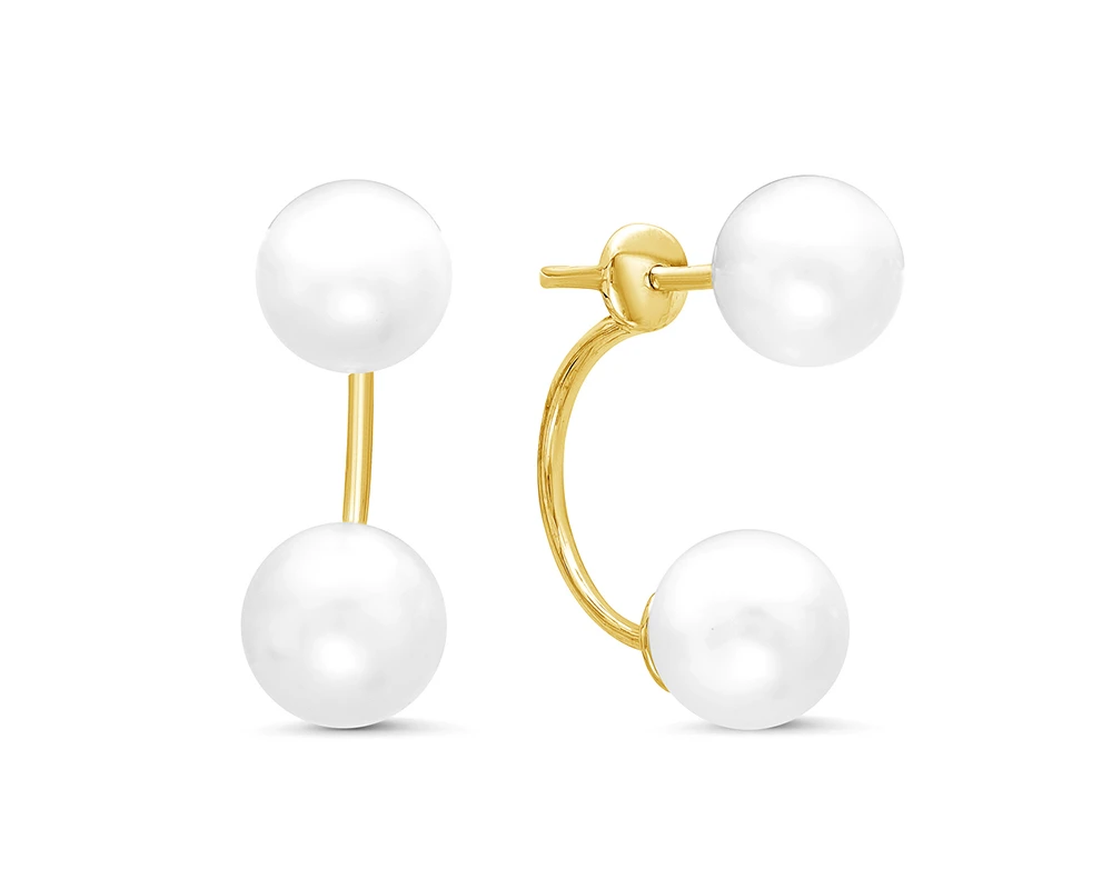 Двойные пусеты из желтого золота 585 пробы украшены белым пресноводным жемчугом. Качество жемчужин на серьгах наивысшее, жемчужины имеют очень яркий перламутровый блеск, гладкую и ровную поверхность с минимальным количеством природных изъянов, форма жемчужин круглая (сфера).