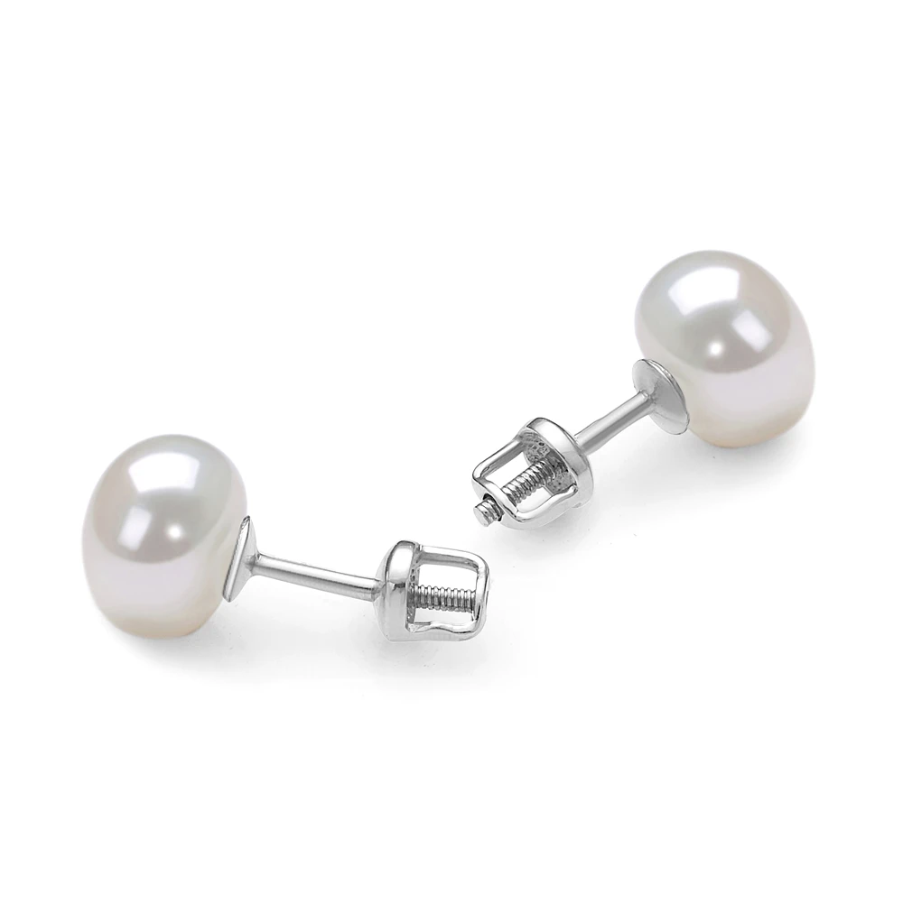 Пусеты из белого серебра 925 пробы украшены белыми пресноводными жемчужинами.