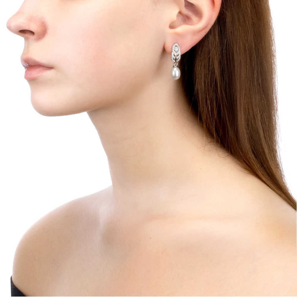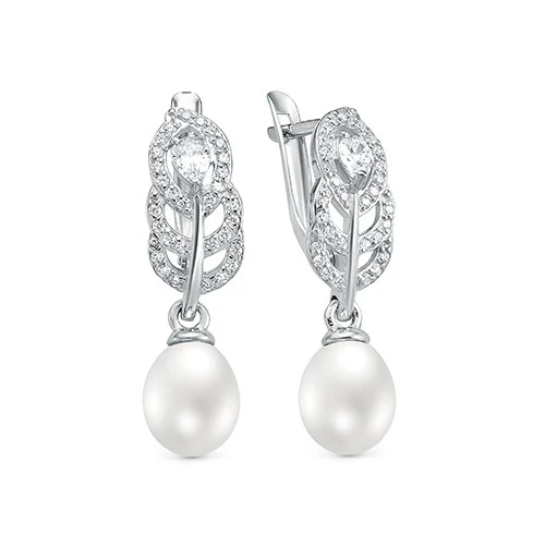 Серьги выполнены из серебра 925 пробы и украшены жемчужинами пресной воды. Качество жемчужин на серьгах наивысшее, жемчужины имеют очень яркий перламутровый блеск, поверхность без дефектов, форма жемчужин идеальная каплевидная.