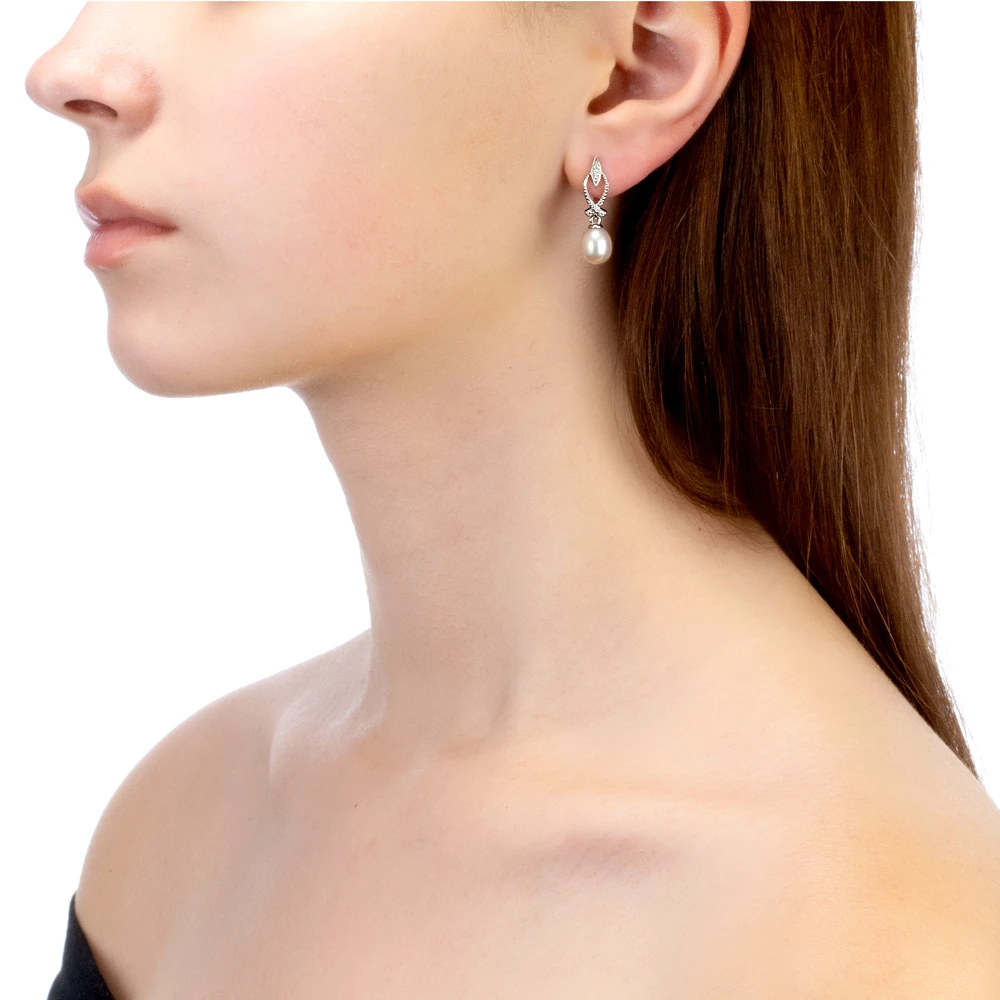Серьги выполнены из серебра 925 пробы и украшены жемчужинами пресной воды. Качество жемчужин на серьгах наивысшее, жемчужины имеют очень яркий перламутровый блеск, поверхность без дефектов, форма жемчужин идеальная каплевидная.