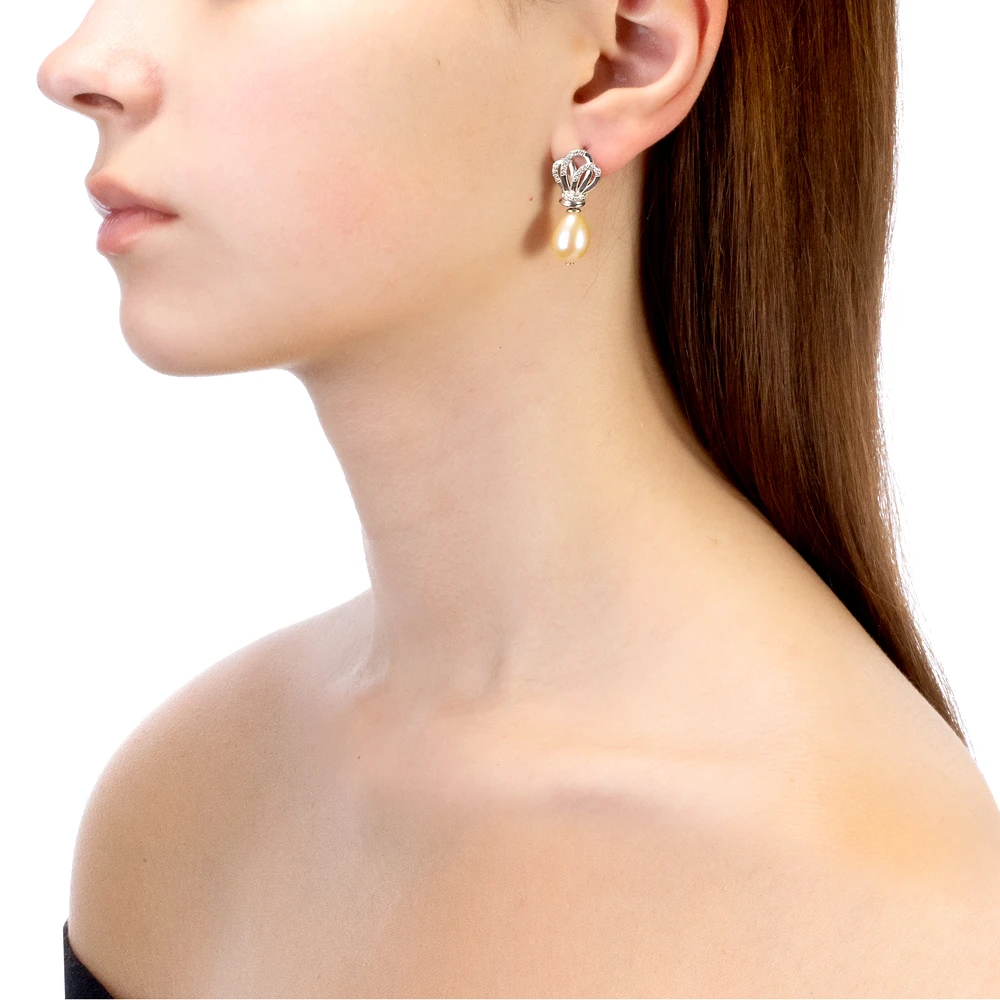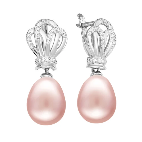 Серьги удлиненные, выполненные из серебра 925 пробы, украшены фианитами и прекрасными розовыми жемчужинами пресной воды. Качество жемчужин на серьгах наивысшее, жемчужины имеют очень яркий перламутровый блеск, поверхность без дефектов, форма жемчужин идеальная каплевидная.