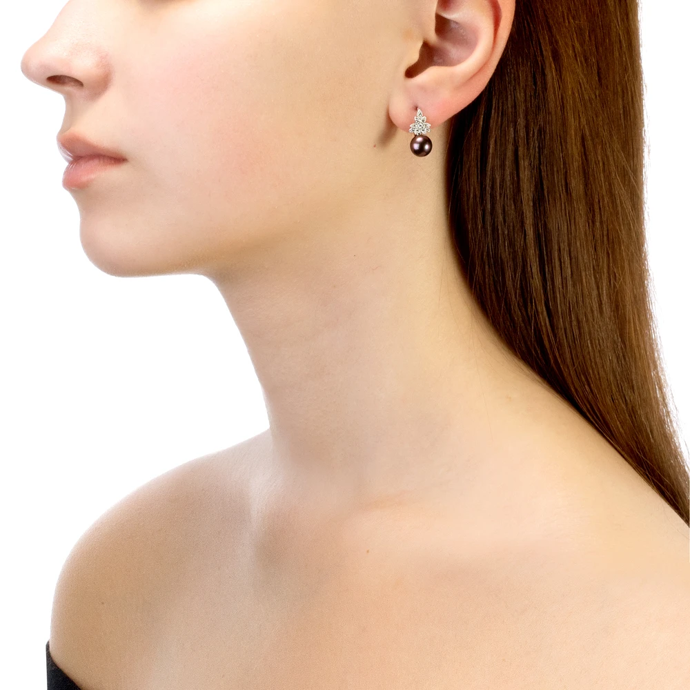 Серьги выполнены из серебра 925 пробы и украшены жемчужинами пресной воды. Качество жемчужин на серьгах наивысшее, жемчужины имеют очень яркий перламутровый блеск, поверхность без дефектов, форма жемчужин сплющенная (пуговица). В наличии есть серьги с жемчужинами различных оттенков черного цвета.