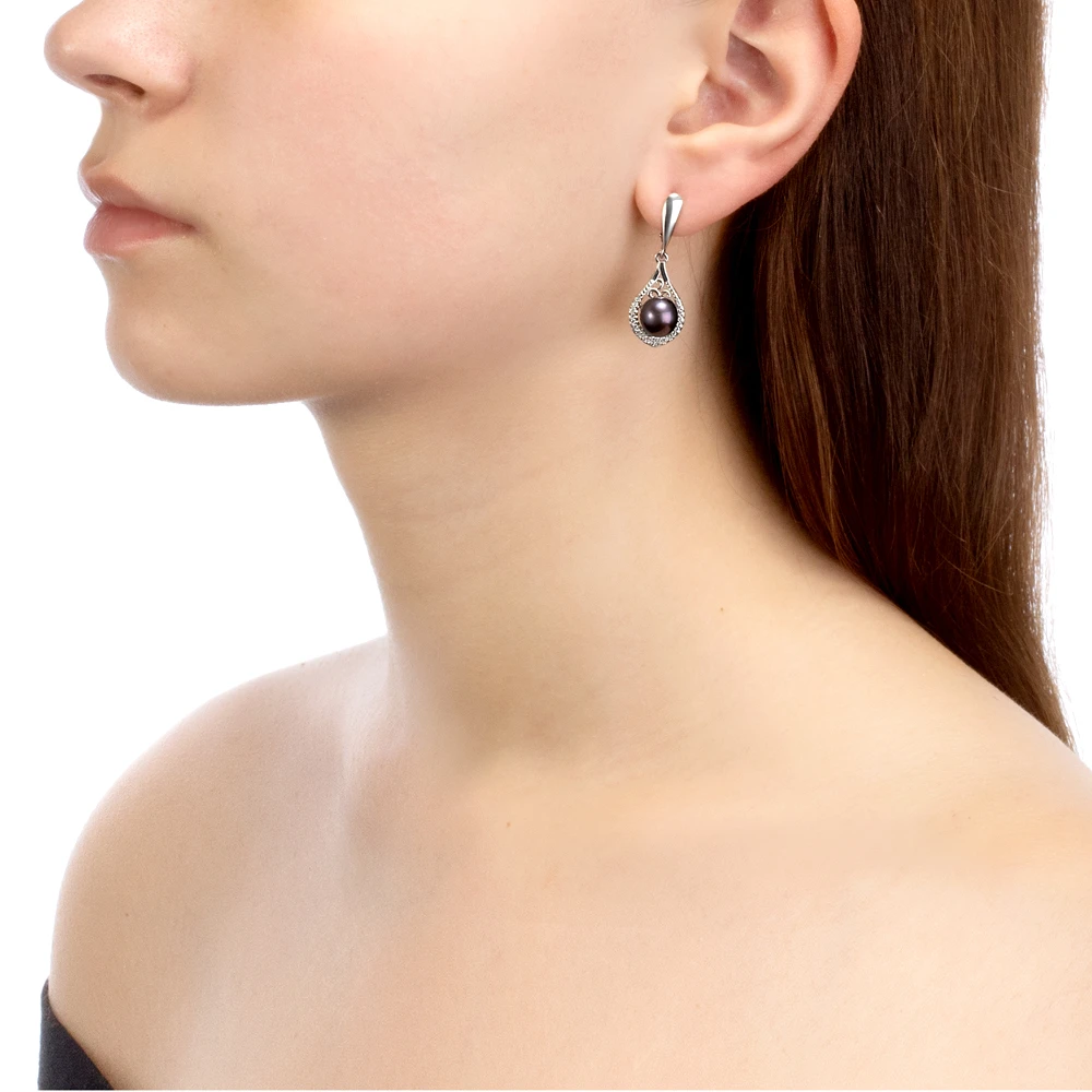 Серьги выполнены из серебра 925 пробы и украшены жемчужинами пресной воды. Качество жемчужин на серьгах наивысшее, жемчужины имеют очень яркий перламутровый блеск, поверхность без дефектов, форма жемчужин сплющенная (пуговица). В наличии есть серьги с жемчужинами различных оттенков черного цвета.