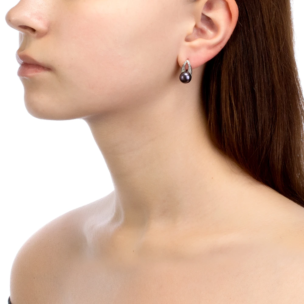 Серьги выполнены из серебра 925 пробы и украшены жемчужинами пресной воды. Качество жемчужин на серьгах наивысшее, жемчужины имеют очень яркий перламутровый блеск, поверхность без дефектов, форма жемчужин сплющенная (пуговица). В наличии есть серьги с жемчужинами различных оттенков черного цвета.