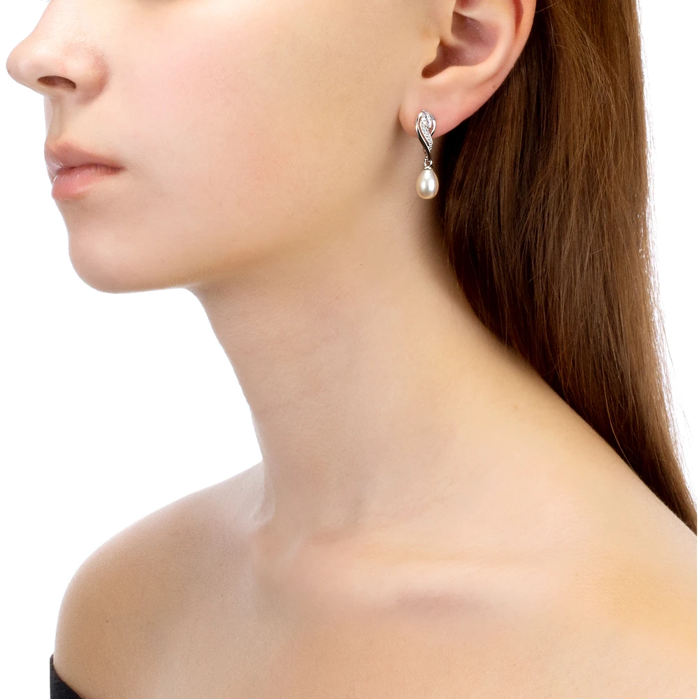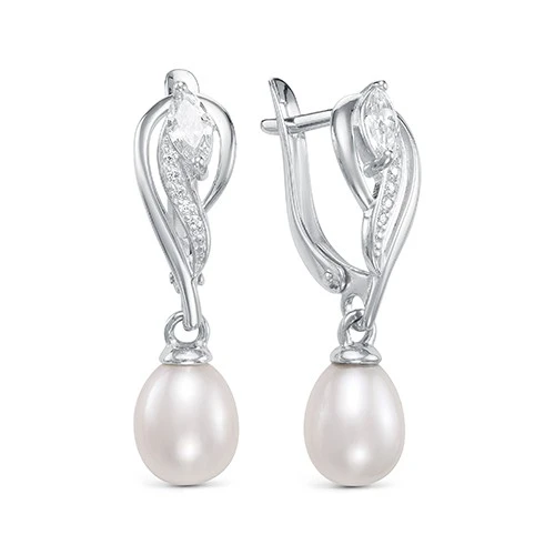 Серьги выполнены из серебра 925 пробы и украшены жемчужинами пресной воды. Качество жемчужин на серьгах наивысшее, жемчужины имеют очень яркий перламутровый блеск, поверхность без дефектов, форма жемчужин идеальная каплевидная.