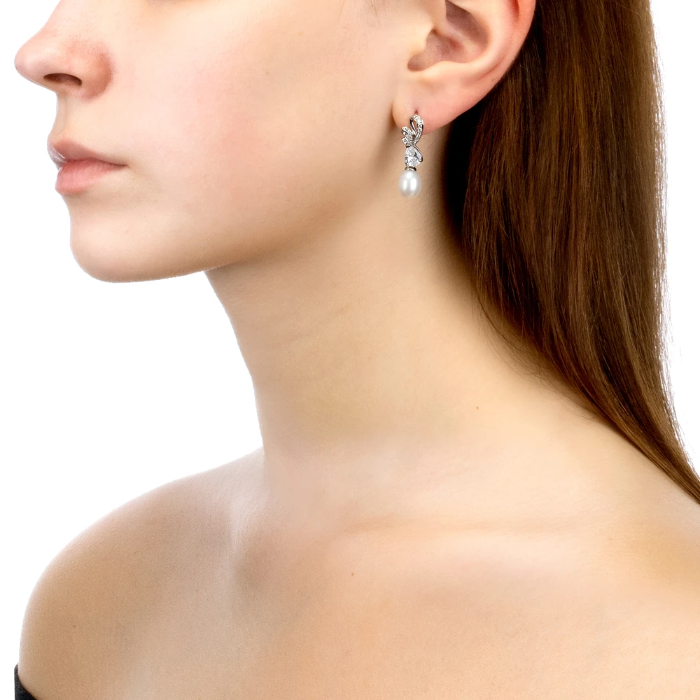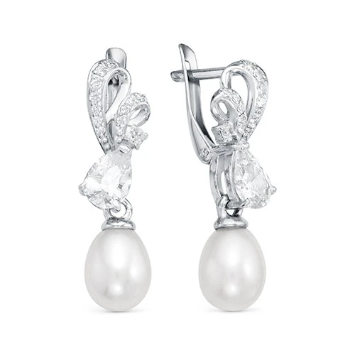 Серьги выполнены из серебра 925 пробы и украшены жемчужинами пресной воды. Качество жемчужин на серьгах наивысшее, жемчужины имеют очень яркий перламутровый блеск, поверхность без дефектов, форма жемчужин идеальная каплевидная.