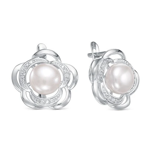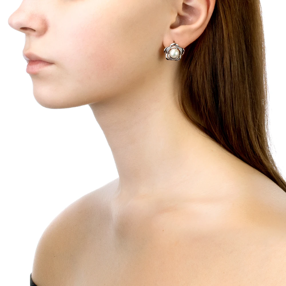 Серьги "Роза" из серебра c белыми речными жемчужинами 8 мм, (3106)