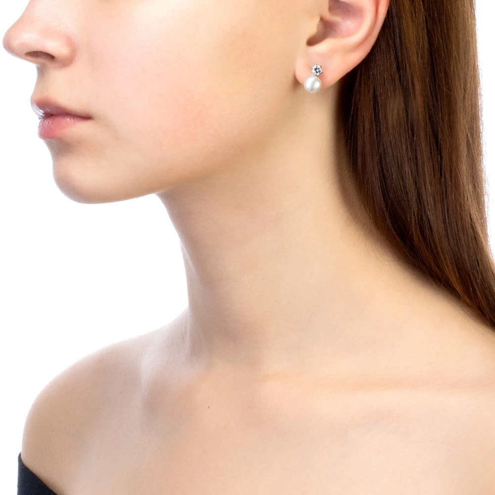 Серьги выполнены из серебра 925 пробы и украшены жемчужинами пресной воды. Качество жемчужин на высокое, жемчужины имеют очень яркий перламутровый блеск, гладкую, ровную поверхность, форма жемчужин сплющенная (пуговица).