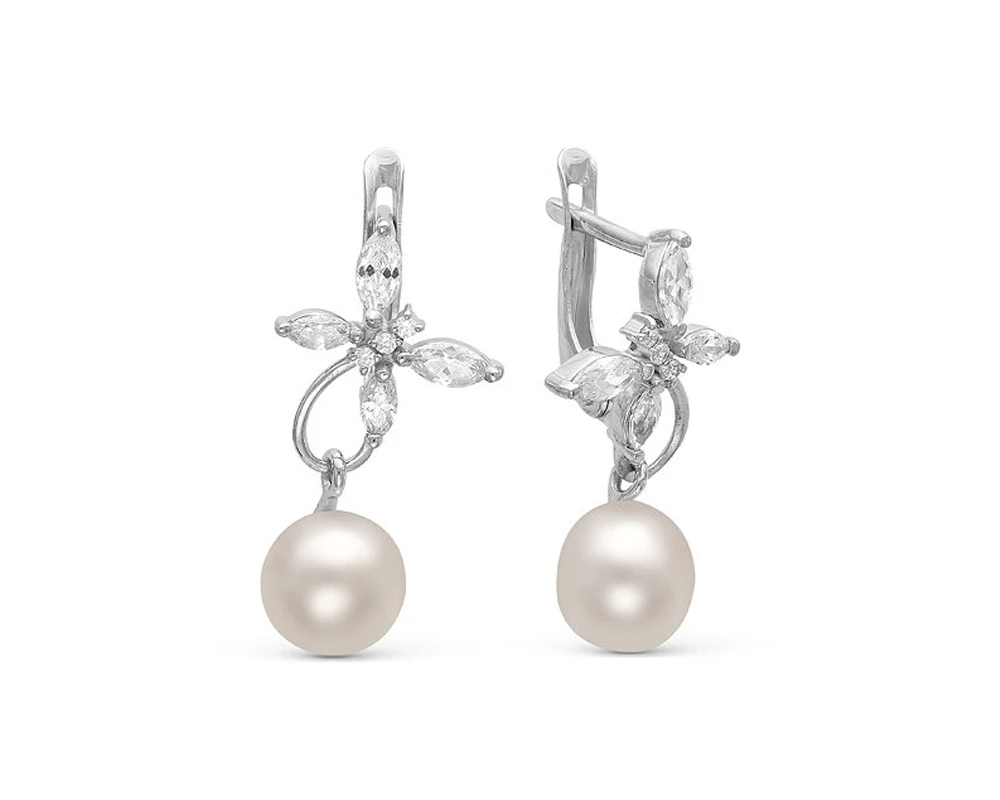 Серьги "Бабочки" из серебра c белыми речными жемчужинами 7,5-8 мм, (4006)