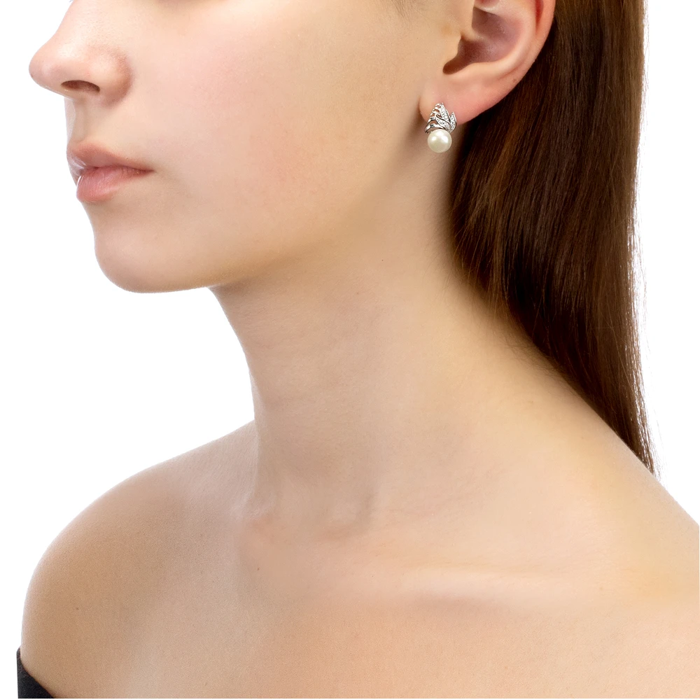 Серьги выполнены из серебра 925 пробы и украшены жемчужинами пресной воды. Качество жемчужин на серьгах наивысшее, жемчужины имеют очень яркий перламутровый блеск, гладкую, ровную поверхность, форма жемчужин сплющенная (пуговица).