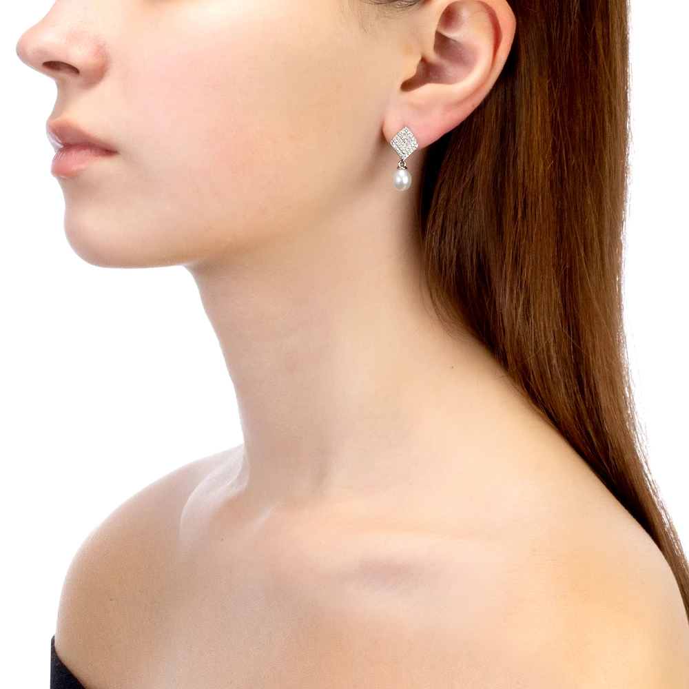Серьги выполнены из серебра 925 пробы и украшены жемчужинами пресной воды. Качество жемчужин на серьгах наивысшее, жемчужины имеют очень яркий перламутровый блеск, поверхность без дефектов, форма жемчужин идеальная каплевидная.