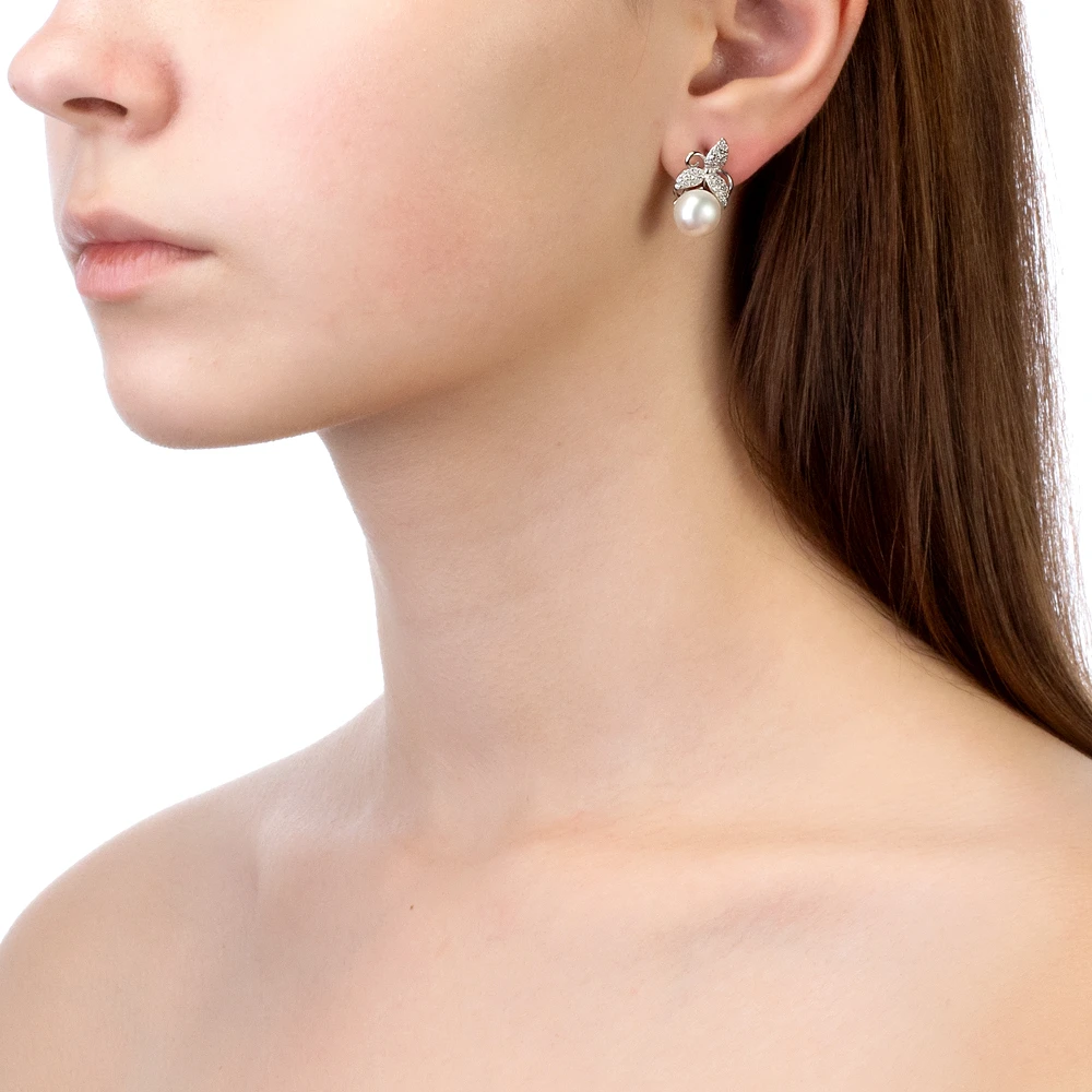 Серьги выполнены из серебра 925 пробы и украшены жемчужинами пресной воды. Качество жемчужин на серьгах наивысшее, жемчужины имеют очень яркий перламутровый блеск, гладкую, ровную поверхность, форма жемчужин сплющенная (пуговица).