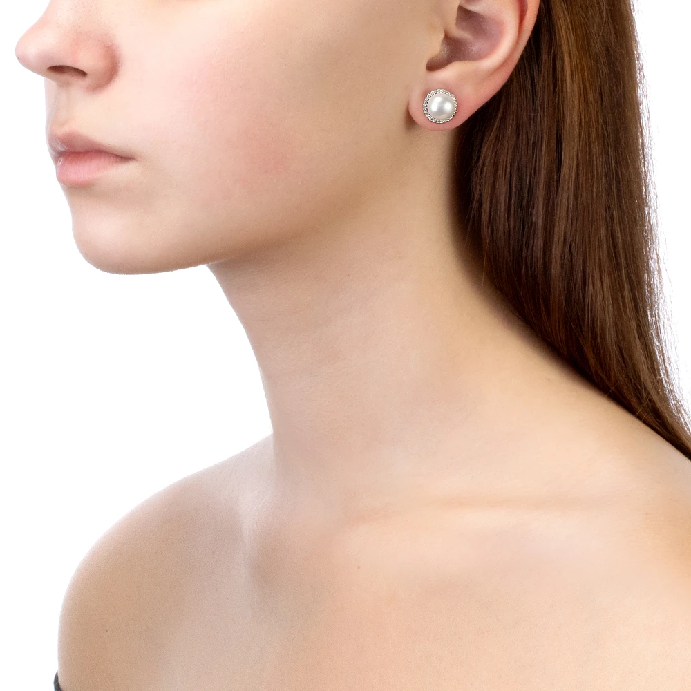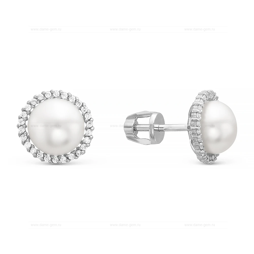 Серьги выполнены из серебра 925 пробы и украшены жемчужинами пресной воды. Качество жемчужин на серьгах наивысшее, жемчужины имеют очень яркий перламутровый блеск, гладкую, ровную поверхность, форма жемчужин сплющенная (пуговица).