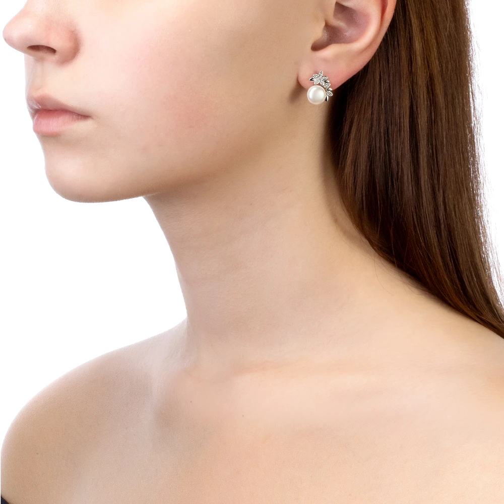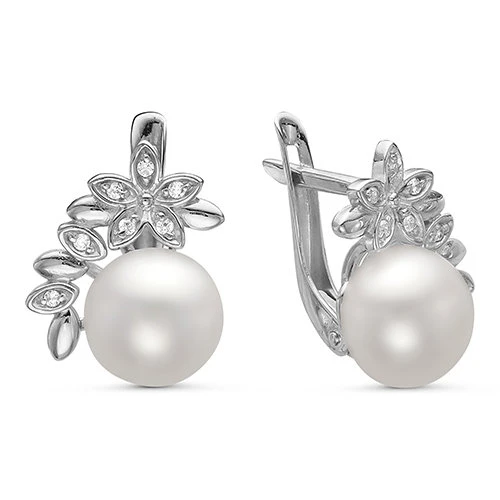 Серьги выполнены из серебра 925 пробы и украшены жемчужинами пресной воды. Качество жемчужин на серьгах наивысшее, жемчужины имеют очень яркий перламутровый блеск, гладкую, ровную поверхность, форма жемчужин сплющенная (пуговица).