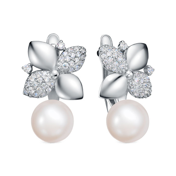 Серьги выполнены из серебра 925 пробы и украшены жемчужинами пресной воды. Качество жемчужин на серьгах наивысшее, жемчужины имеют очень яркий перламутровый блеск, гладкую, ровную поверхность, форма жемчужин сплющенная (пуговица).