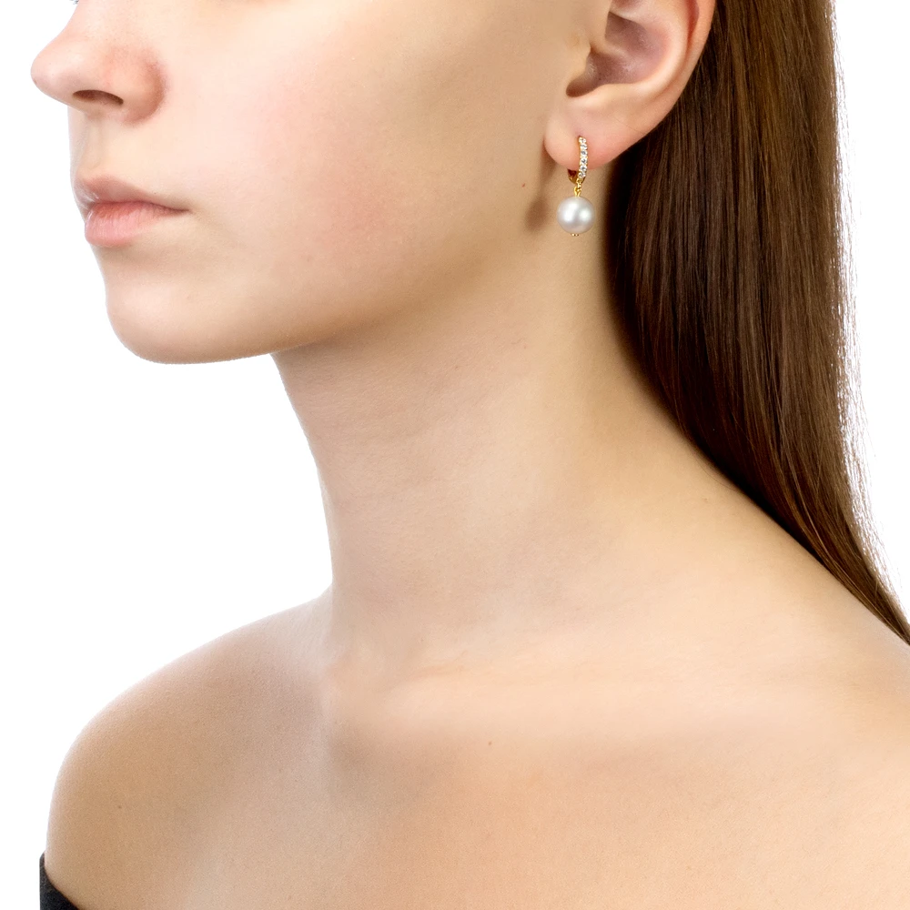 Серьги выполнены из серебра 925 пробы с покрытием "желтое золото", украшены белыми жемчужинами пресной воды. Качество жемчужин среднее, на поверхности жемчуга есть природные повреждения.
