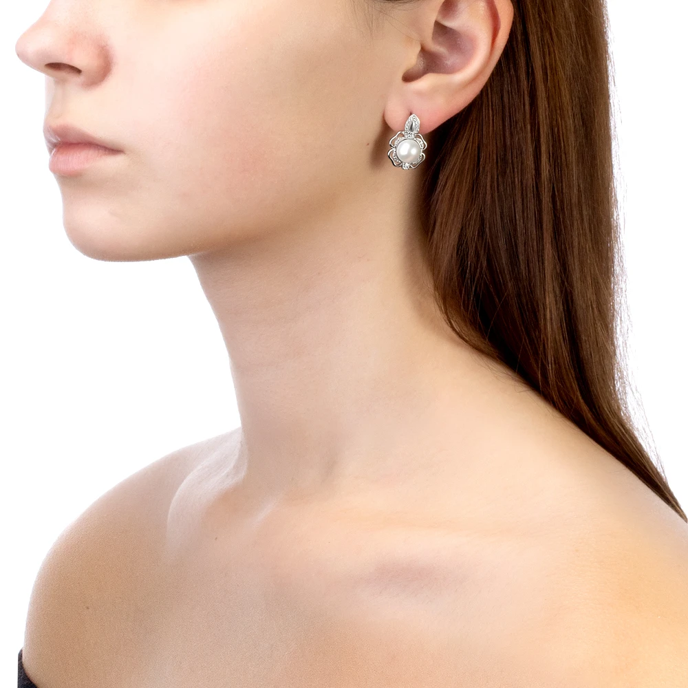 Серьги выполнены из серебра 925 пробы и украшены жемчужинами пресной воды. Качество жемчужин на серьгах наивысшее, жемчужины имеют очень яркий перламутровый блеск, гладкую, ровную поверхность, форма жемчужин сплющенная (пуговица).