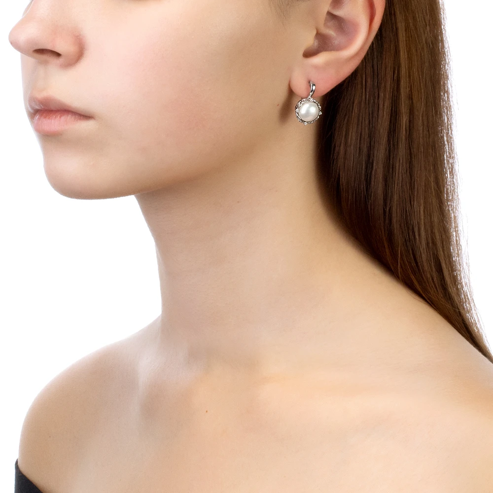 Серьги выполнены из серебра 925 пробы и украшены жемчужинами пресной воды. Качество жемчужин на серьгах наивысшее, жемчужины имеют очень яркий перламутровый блеск, гладкую, ровную поверхность, форма жемчужин сплющенная (пуговица).