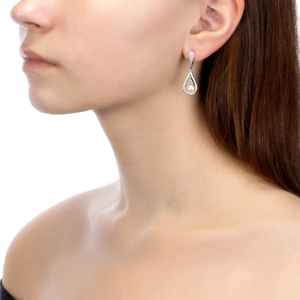 Серьги выполнены из серебра 925 пробы и украшены жемчужинами пресной воды. Качество жемчужин на серьгах наивысшее, жемчужины имеют очень яркий перламутровый блеск, гладкую, ровную поверхность, форма жемчужин сплющенная (пуговица).