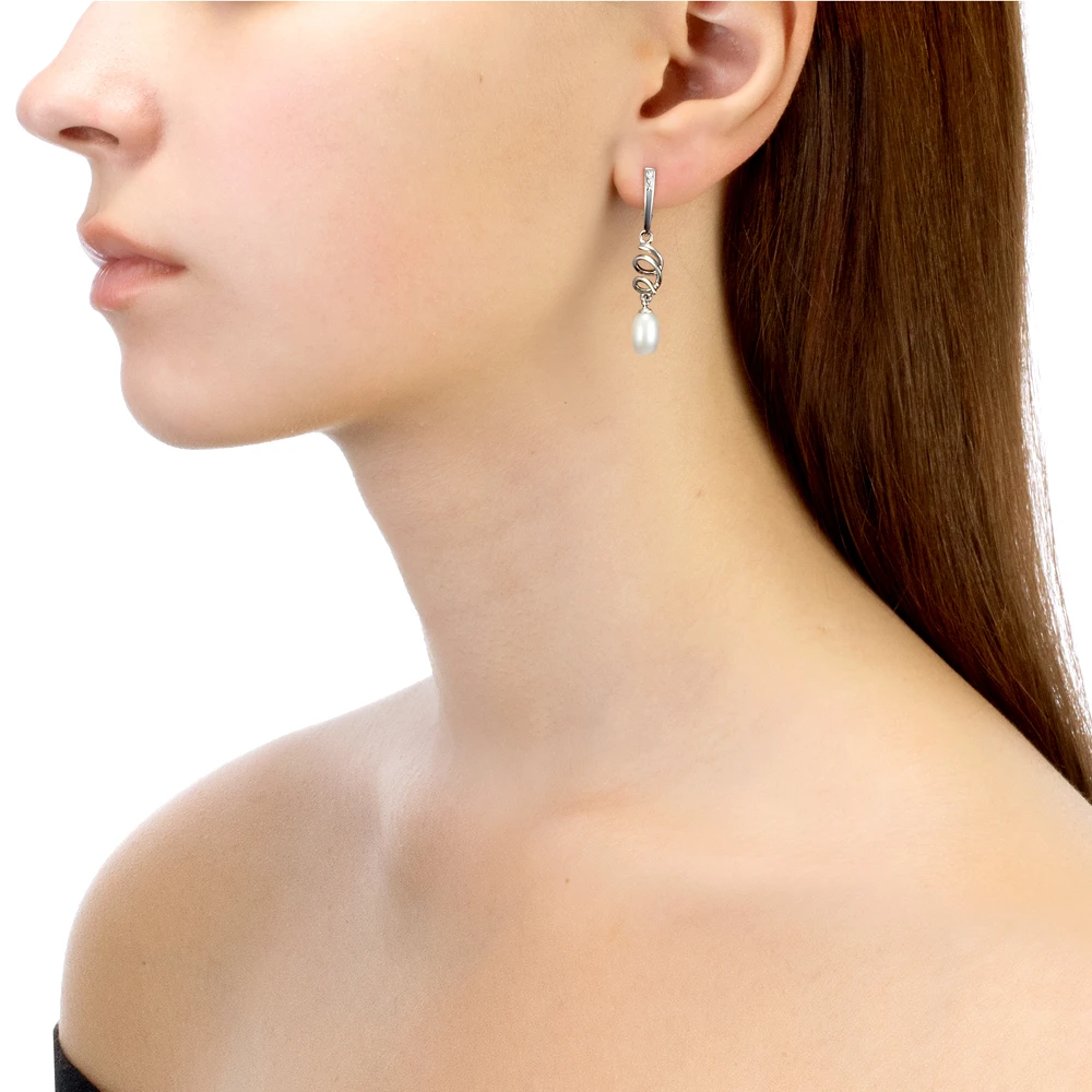 Серьги выполнены из серебра 925 пробы и украшены жемчужинами пресной воды. Качество жемчужин на серьгах наивысшее, жемчужины имеют очень яркий перламутровый блеск, поверхность без дефектов, форма жемчужин идеальная каплевидная.