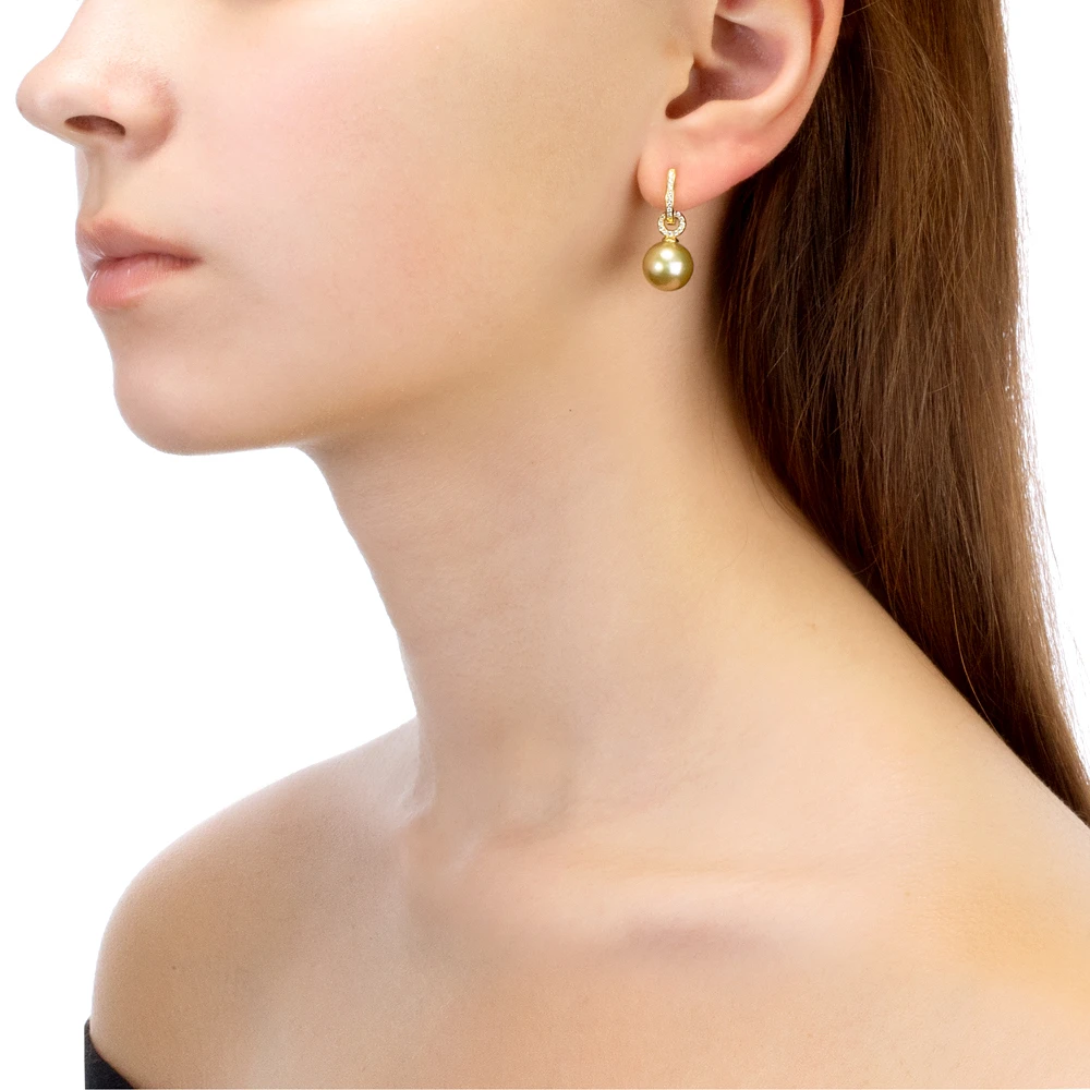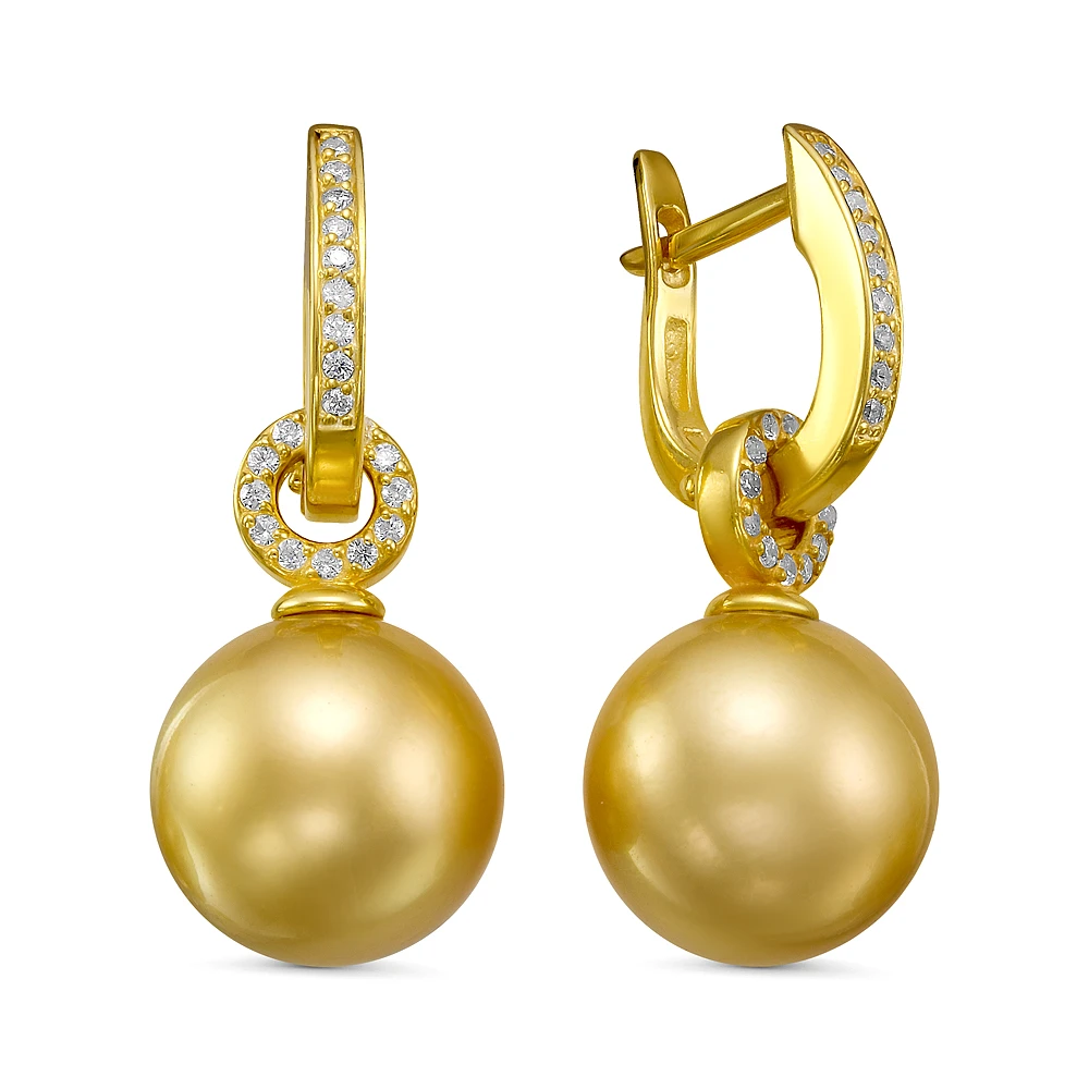 Серьги-трансформеры выполнены из серебра 925 пробы с желтым золотым покрытием, украшены круглыми золотистыми морскими жемчужинами (Австралия). Качество жемчужин выше среднего, на поверхности жемчужин есть природные дефекты, блеск жемчужин очень яркий, цвет насыщенный золотой.