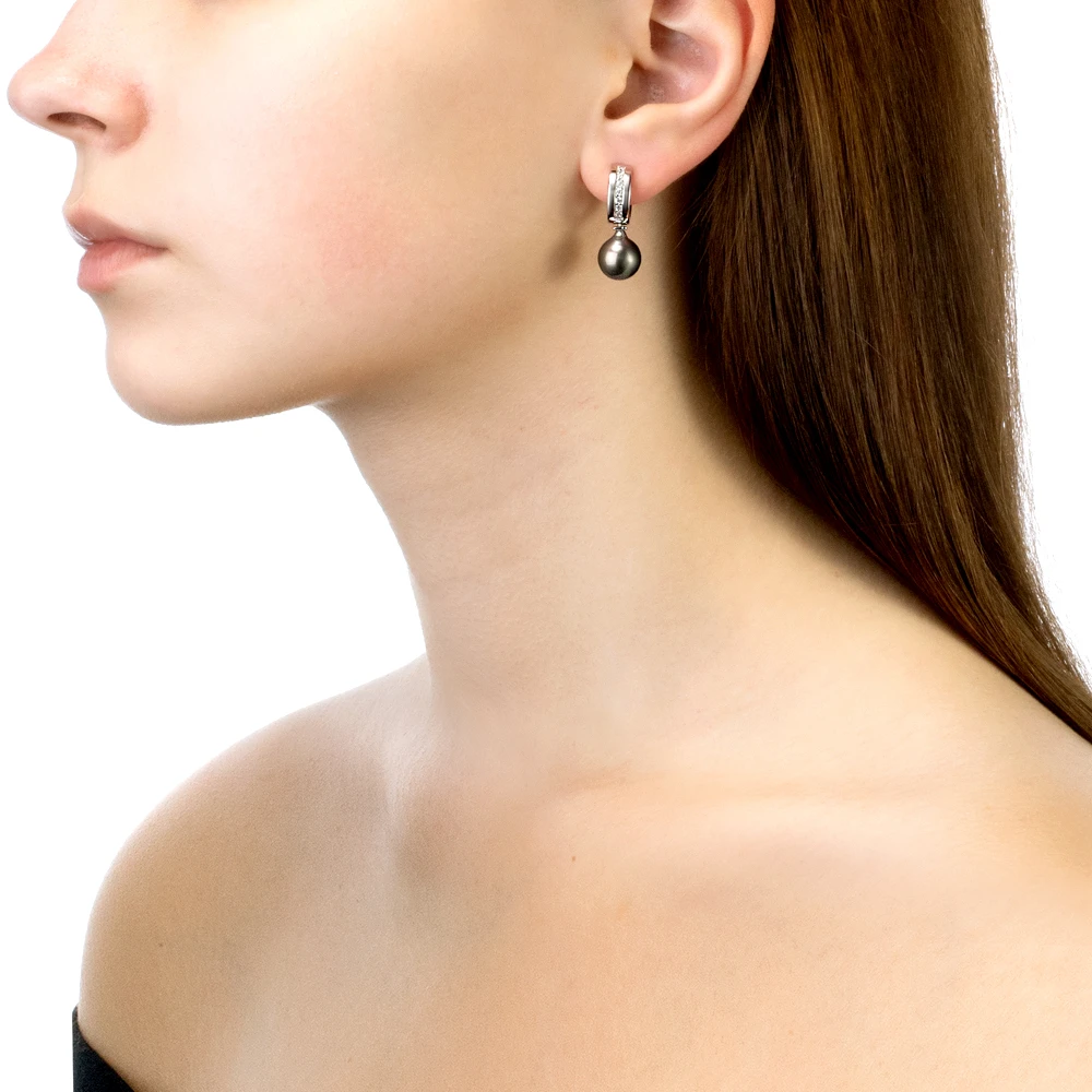 Серьги из серебра c черными морскими Таитянскими жемчужинами 9,6-9,9 мм, (3587)