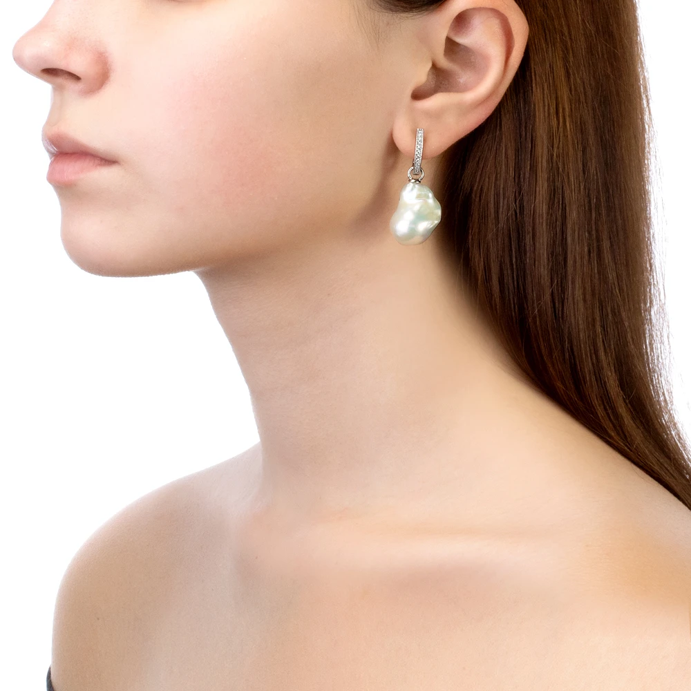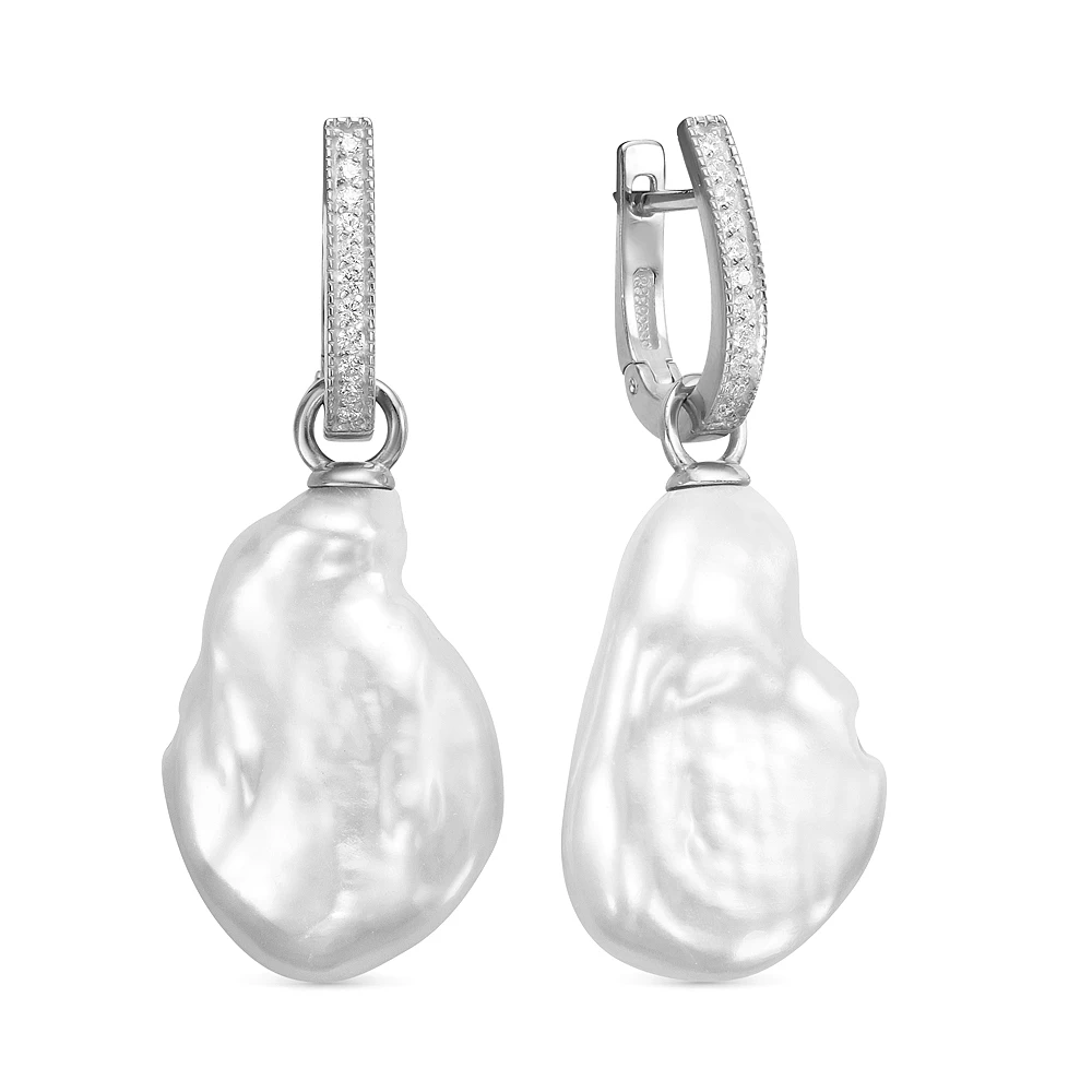 Серьги из серебра с белыми речными жемчужинами "Барокко" 13-16 мм, (7281)