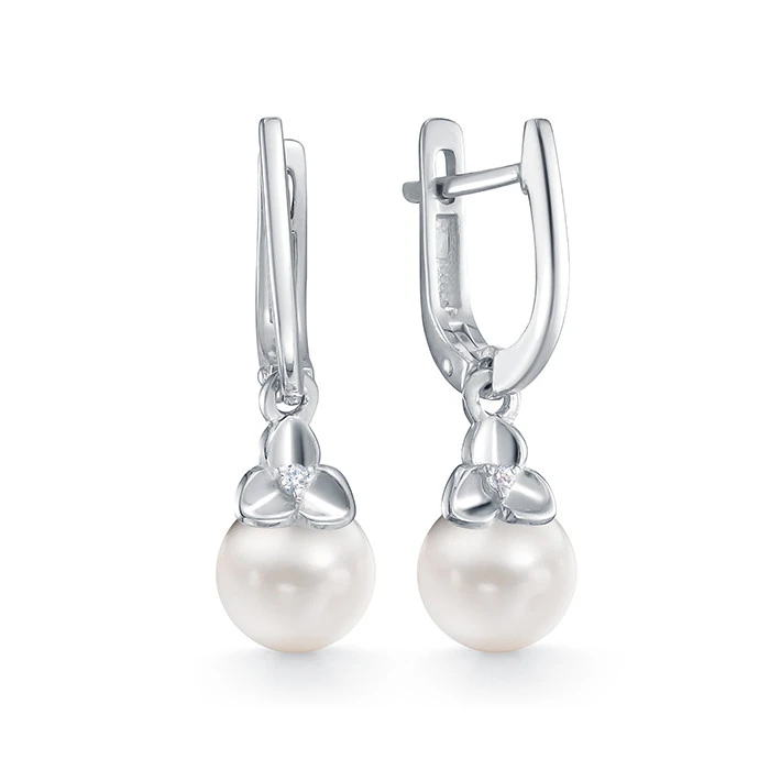 Серьги выполнены из серебра 925 пробы и украшены жемчужинами пресной воды. Качество жемчужин на серьгах наивысшее, жемчужины имеют очень яркий перламутровый блеск, поверхность без дефектов, форма жемчужин сплющенная (пуговица).