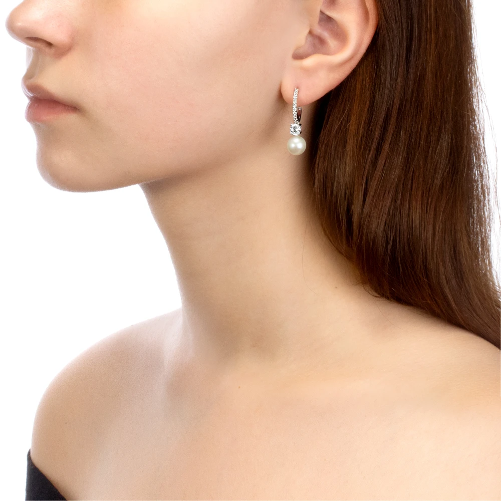 Серьги выполнены из серебра 925 пробы и украшены жемчужинами пресной воды. Качество жемчужин на серьгах наивысшее, жемчужины имеют очень яркий перламутровый блеск, поверхность без дефектов, форма жемчужин идеальная круглая.