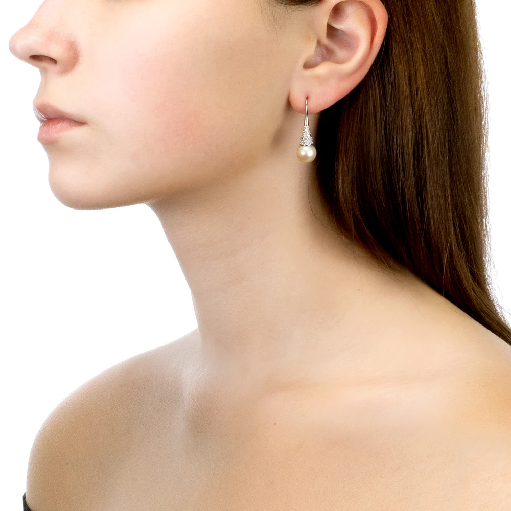 Серьги выполнены из серебра 925 пробы и украшены жемчужинами пресной воды. Качество жемчужин на серьгах наивысшее, жемчужины имеют очень яркий перламутровый блеск, поверхность без дефектов, форма жемчужин идеальная круглая.