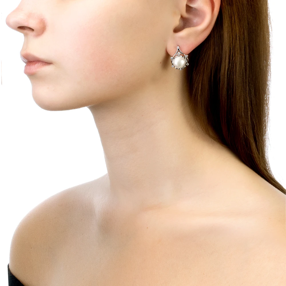 Серьги выполнены из серебра 925 пробы и украшены жемчужинами пресной воды. Качество жемчужин на серьгах наивысшее, жемчужины имеют очень яркий перламутровый блеск, гладкую, ровную поверхность, форма жемчужин сплющенная (пуговица).