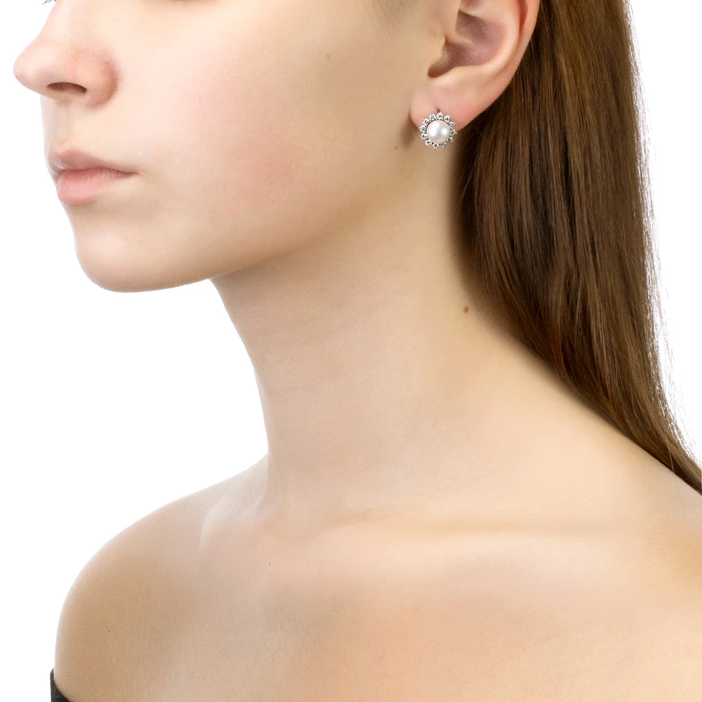 Серьги выполнены из серебра 925 пробы и украшены жемчужинами пресной воды. Качество жемчужин на серьгах наивысшее, жемчужины имеют очень яркий перламутровый блеск, гладкую, ровную поверхность, форма жемчужин сплющенная (пуговица).