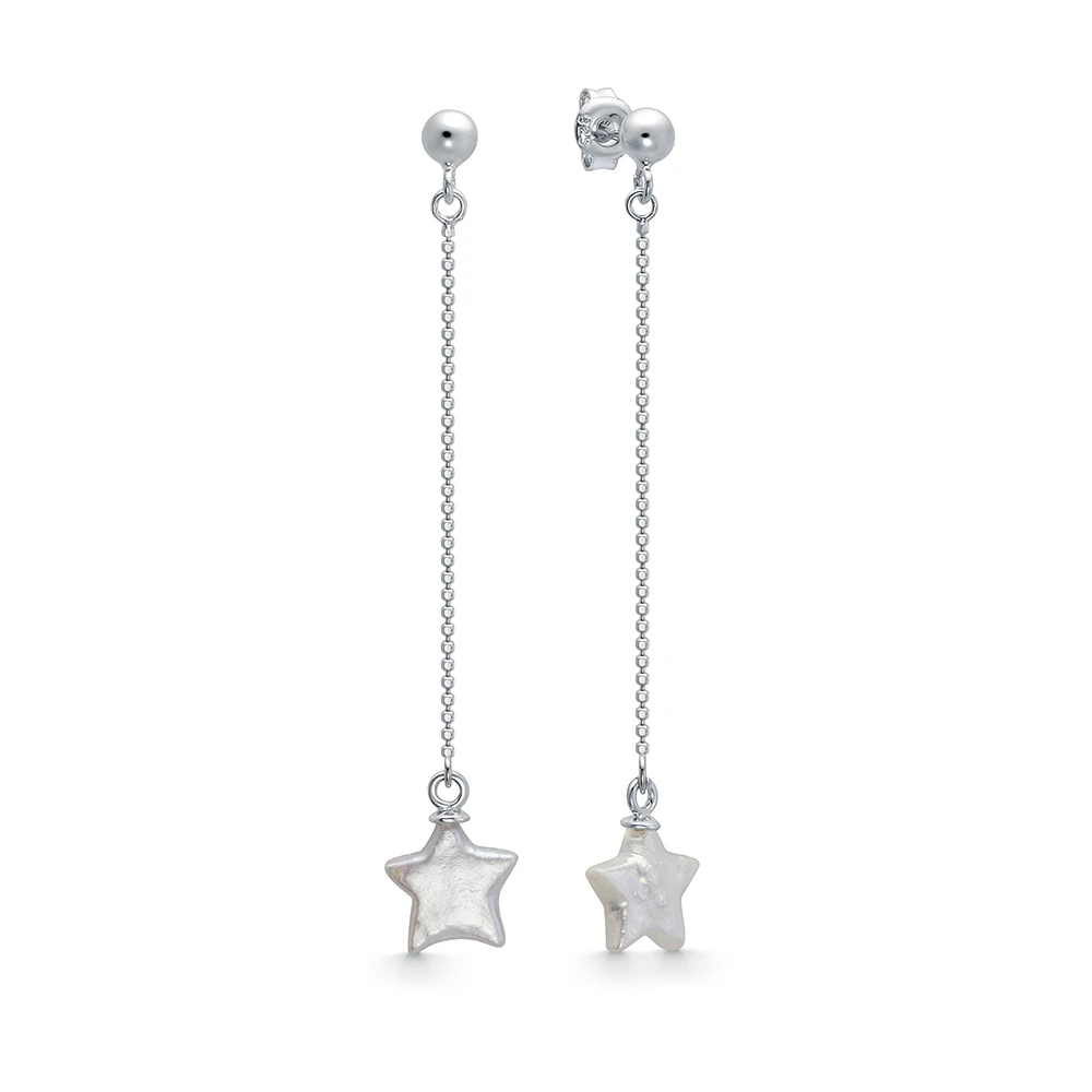Изящные серьги из серебра 925 пробы украшены барочными речными жемчужинами в форме звездочек. Качество жемчужин на серьгах наивысшее, жемчужины имеют очень яркий перламутровый блеск.