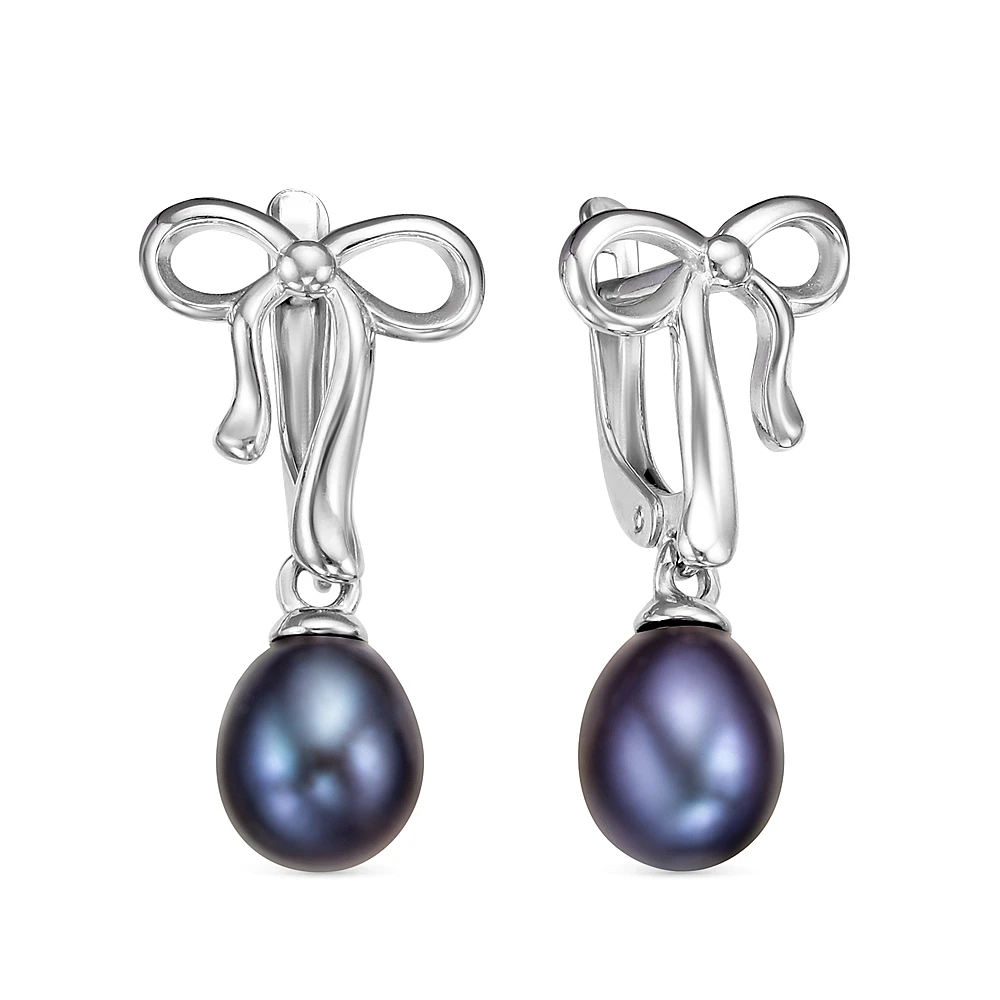 Серьги "Бантики" из серебра с черными речными жемчужинами 7,5-8 мм, (3788)
