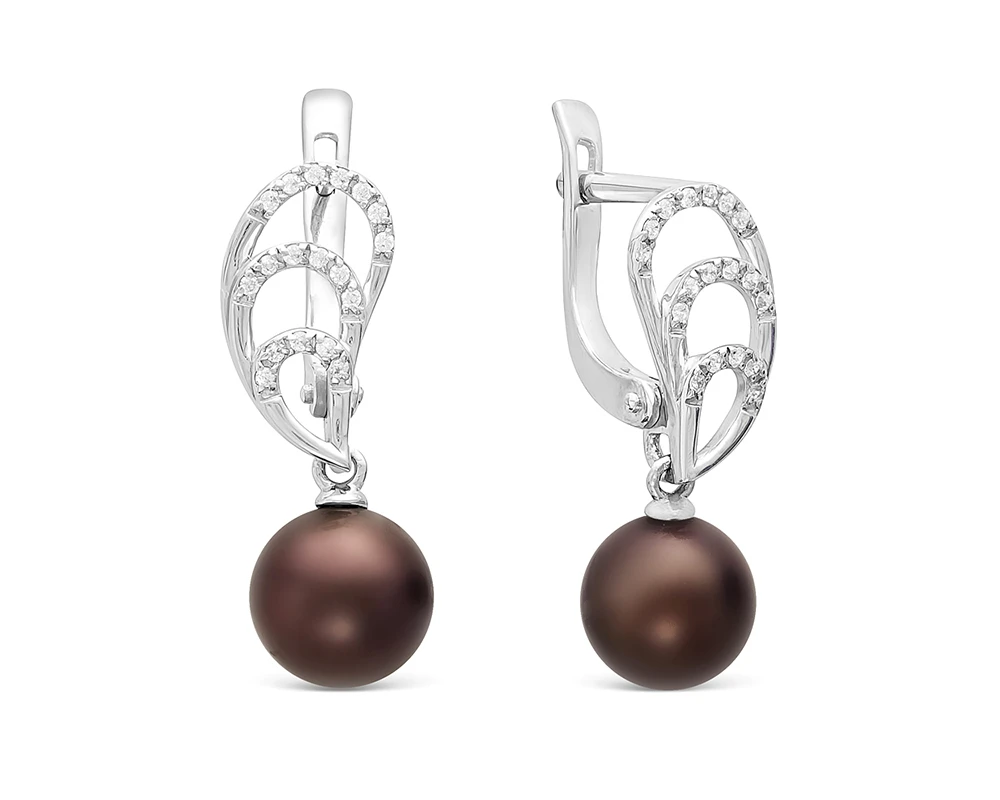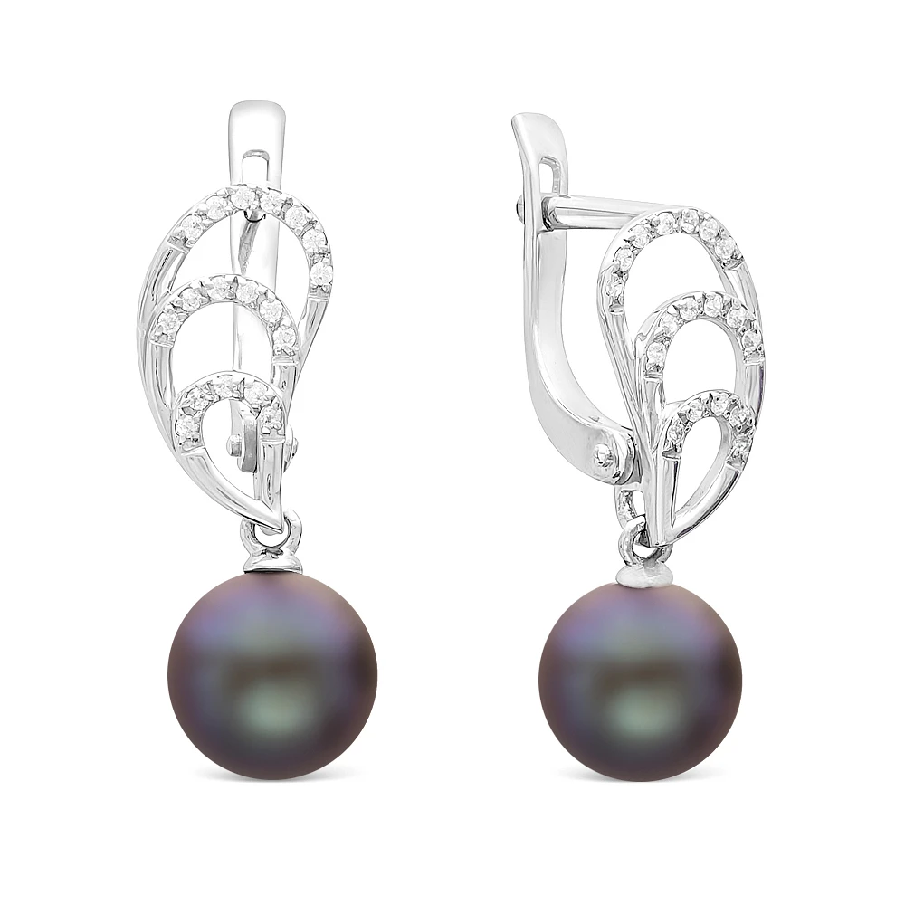 Серьги выполнены из серебра 925 пробы и украшены жемчужинами пресной воды. Качество жемчужин на серьгах наивысшее, жемчужины имеют очень яркий перламутровый блеск, поверхность без дефектов, форма жемчужин идеальная круглая. В наличии есть серьги с жемчужинами различных оттенков черного цвета.