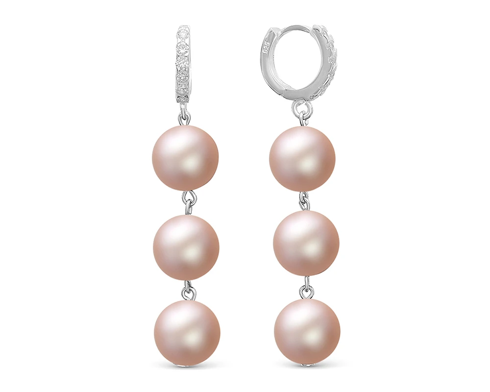 Серьги из серебра 925 пробы украшены розовым пресноводным жемчугом. Вставки - фианиты. Тип замка - Конго. Покрытие - родий. Длина серег - 4,5 см.