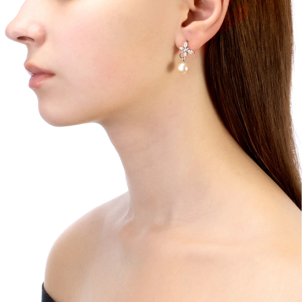 Серьги выполнены из серебра 925 пробы и украшены жемчужинами пресной воды. Качество жемчужин на серьгах наивысшее, жемчужины имеют очень яркий перламутровый блеск, поверхность без дефектов, форма жемчужин сплющенная (пуговица).
