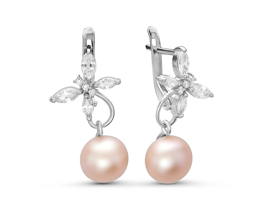 Серьги "Бабочки" из серебра с розовыми речными жемчужинами 8,5-9 мм, (3357)