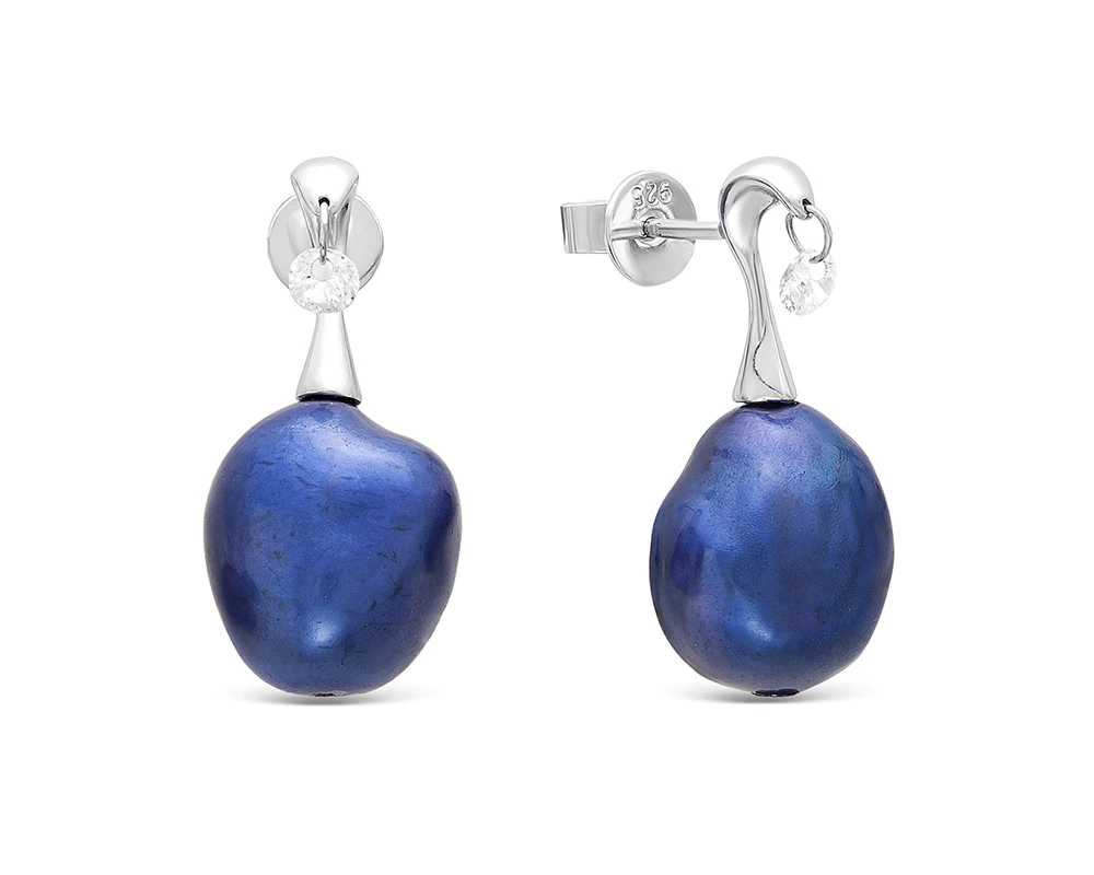 Серьги из серебра с синими речными жемчужинами "Барокко" 11-12 мм, (3980)