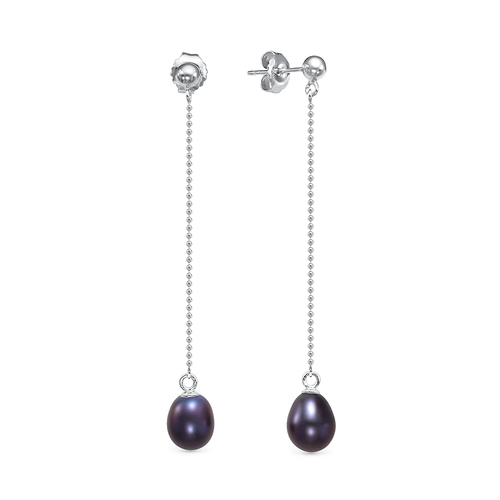 Серьги на цепочке из серебра с черными жемчужинами 7,5-8 мм, (7301)