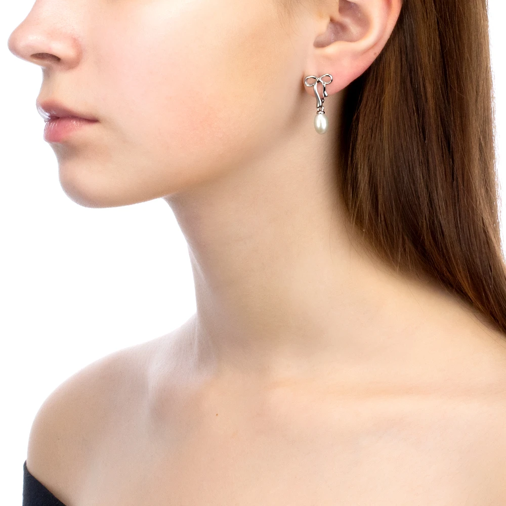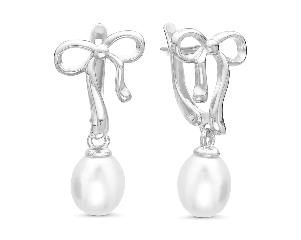 Серьги "Бантики" из серебра с белыми речными жемчужинами 7,5-8 мм, (4096)