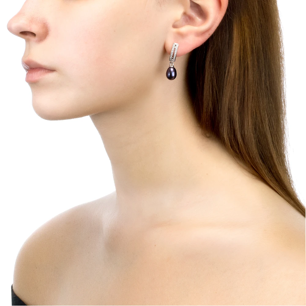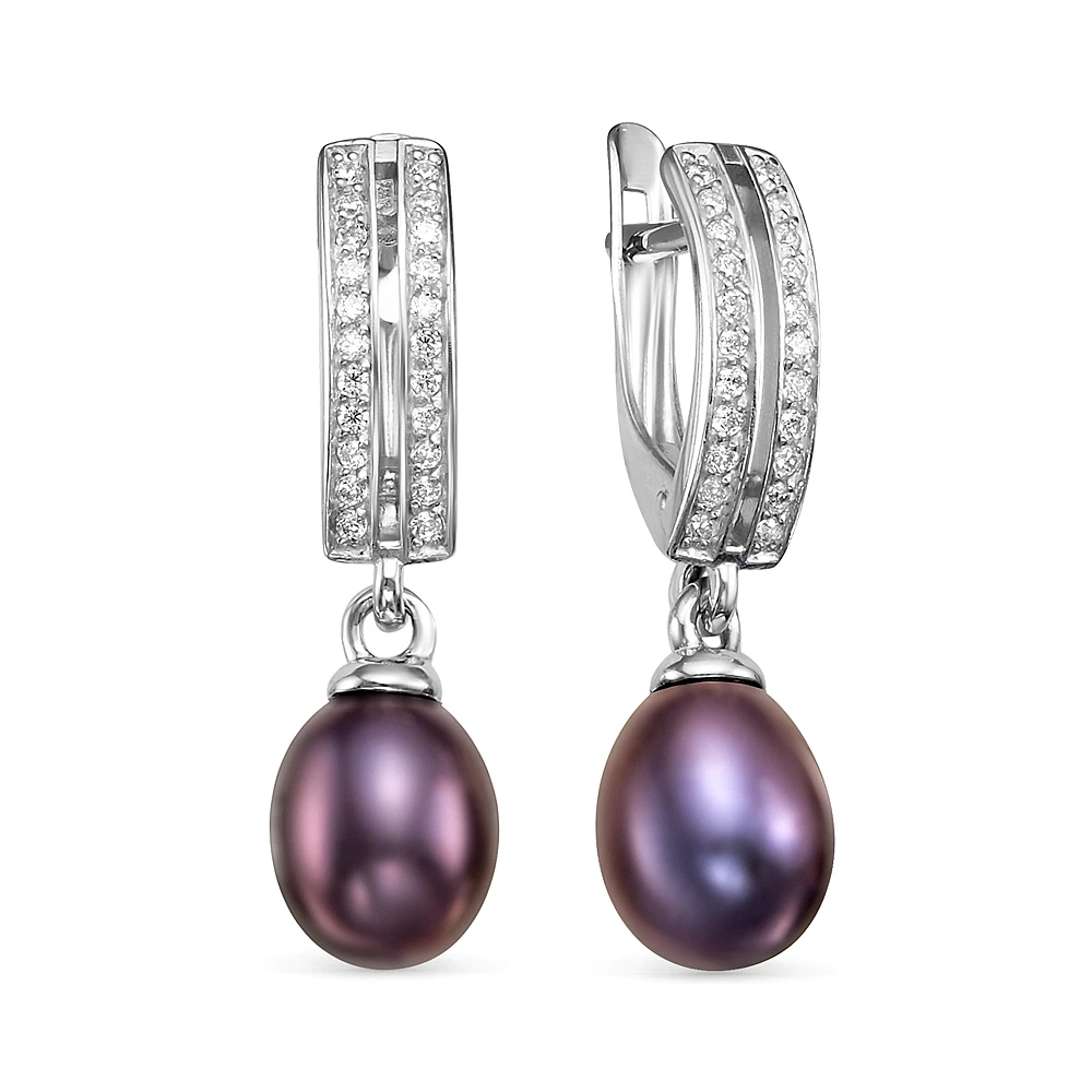 Серьги из серебра 925 пробы украшены черным пресноводным жемчугом. Качество жемчужин на серьгах наивысшее, жемчужины имеют очень яркий перламутровый блеск, поверхность без дефектов, форма жемчужин идеальная каплевидная.
