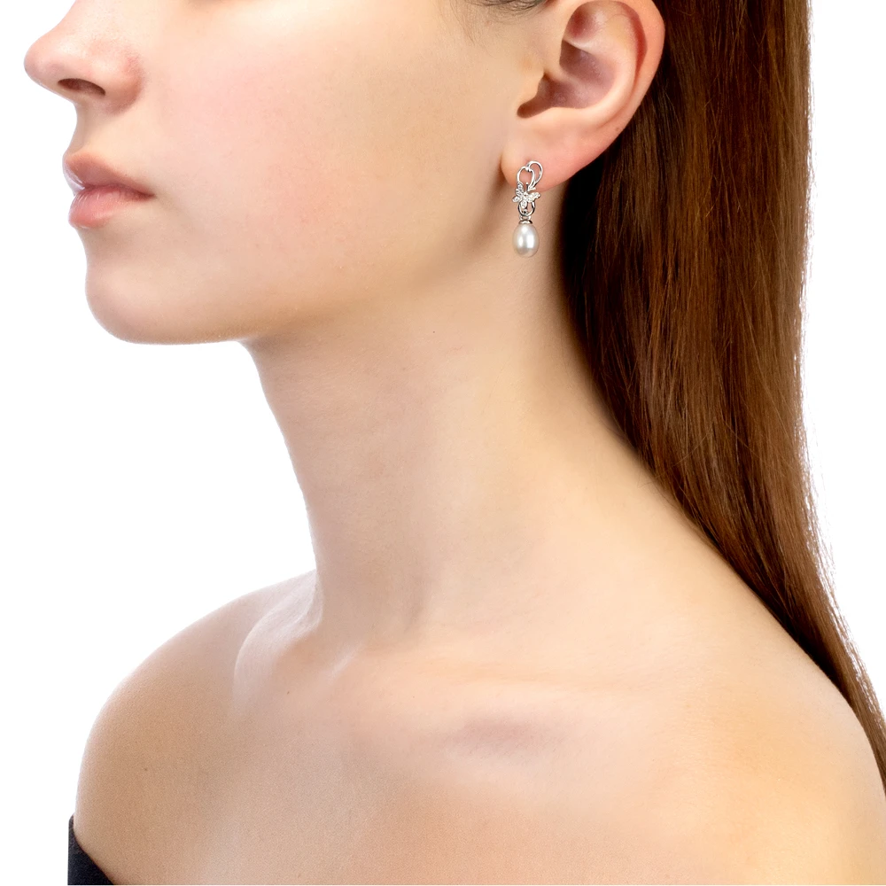 Серьги выполнены из серебра 925 пробы и украшены жемчужинами пресной воды. Качество жемчужин на серьгах наивысшее, жемчужины имеют очень яркий перламутровый блеск, поверхность без дефектов, форма жемчужин идеальная каплевидная.