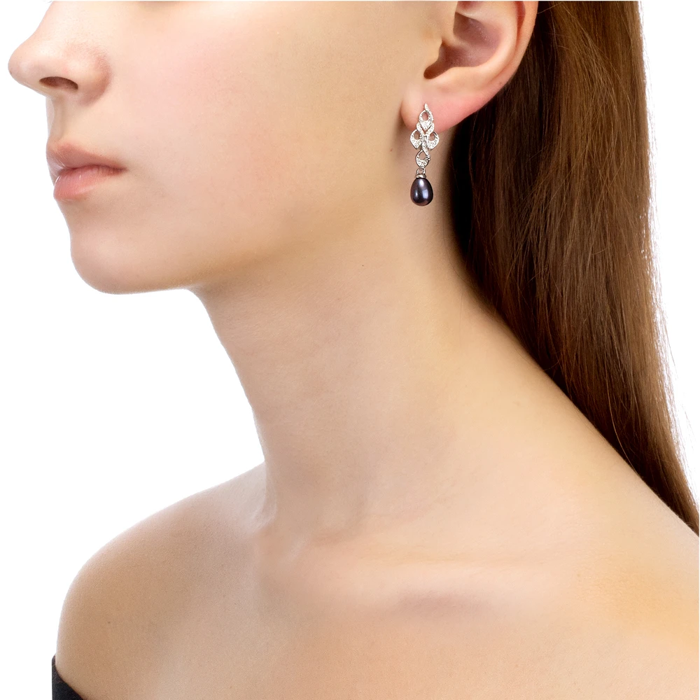 Серьги из серебра 925 пробы украшены черным пресноводным жемчугом. Качество жемчужин на серьгах наивысшее, жемчужины имеют очень яркий перламутровый блеск, поверхность без дефектов, форма жемчужин идеальная каплевидная.