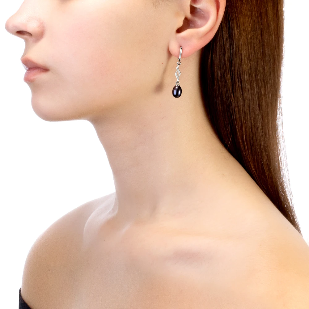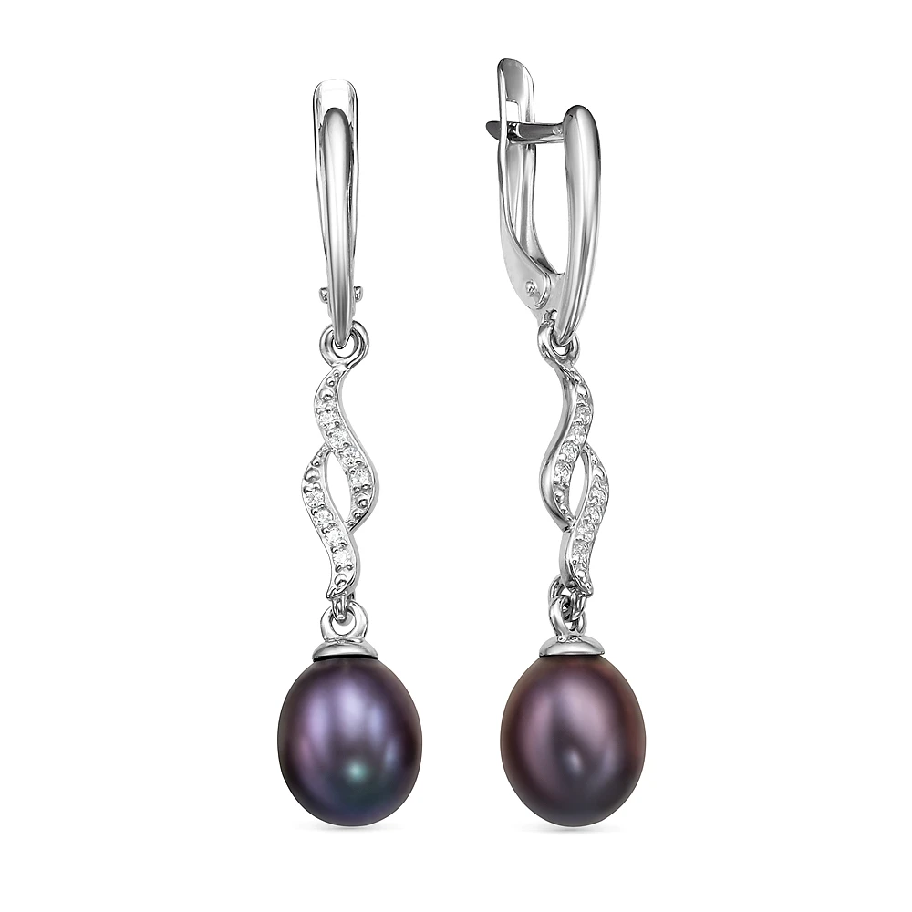 Серьги из серебра 925 пробы украшены черным пресноводным жемчугом. Качество жемчужин на серьгах наивысшее, жемчужины имеют очень яркий перламутровый блеск, поверхность без дефектов, форма жемчужин идеальная каплевидная.