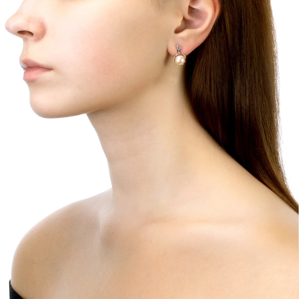 Серьги выполнены из белого золота 585 пробы и украшены жемчужинами пресной воды. Качество жемчужин на серьгах наивысшее, жемчужины имеют очень яркий перламутровый блеск, гладкую и ровную поверхность с минимальным количеством природных изъянов, форма жемчужин сплющенная (пуговица).