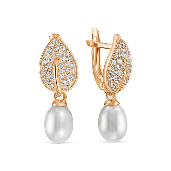 Серьги выполнены из красного золота 585 пробы и украшены жемчужинами пресной воды. Качество жемчужин на серьгах наивысшее, жемчужины имеют очень яркий перламутровый блеск, гладкую и ровную поверхность с минимальным количеством природных изъянов, форма жемчужин каплевидная.