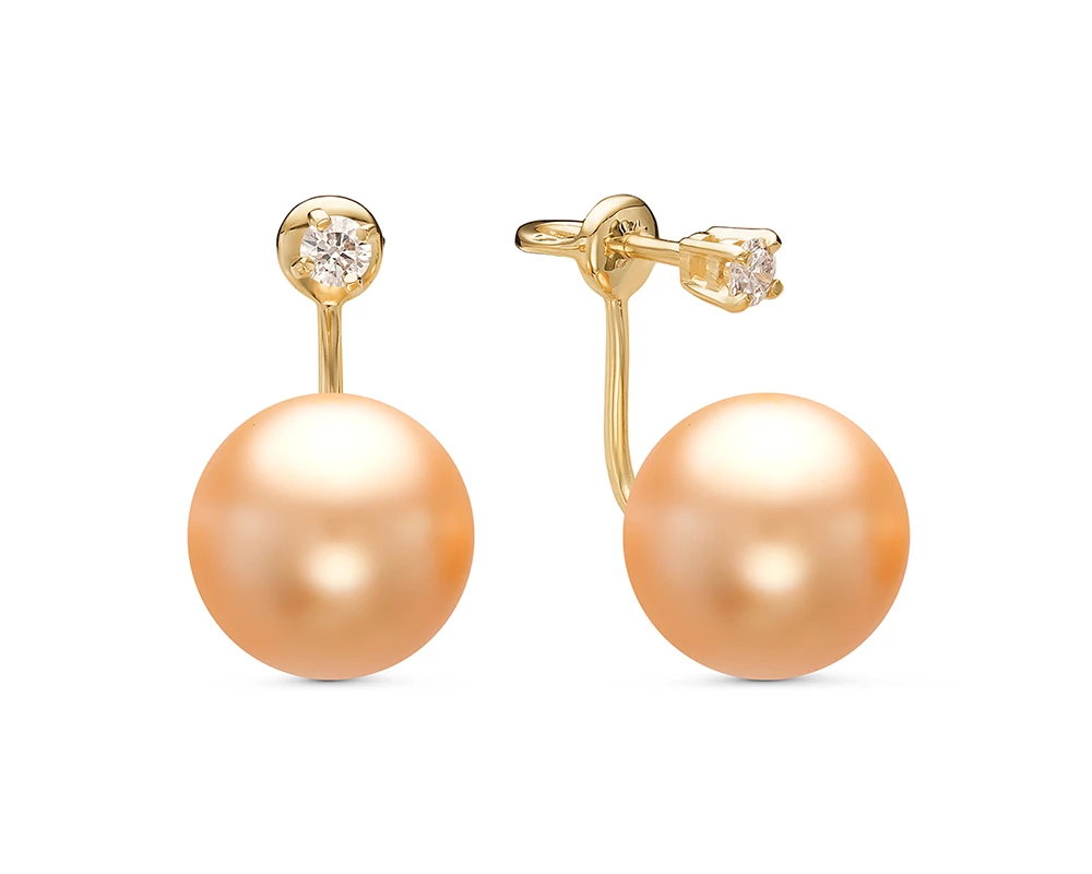 Двойные серьги-пусеты "Диор" выполнены из желтого золота 585 пробы и украшены золотистыми Австралийскими морскими жемчужинами. Качество жемчужин на серьгах наивысшее, жемчужины имеют очень яркий перламутровый блеск, природные изъяны на поверхности жемчуга отсутствуют или имеются в единичном количестве. Форма жемчужин идеальная круглая.