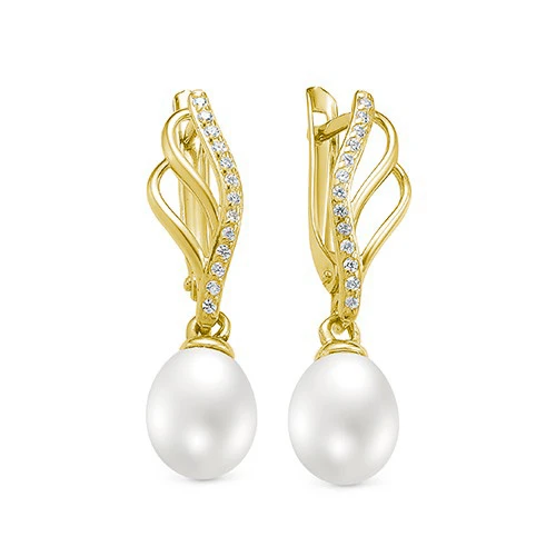 Серьги из желтого золота с белыми речными жемчужинами 9-10 мм, (7596)