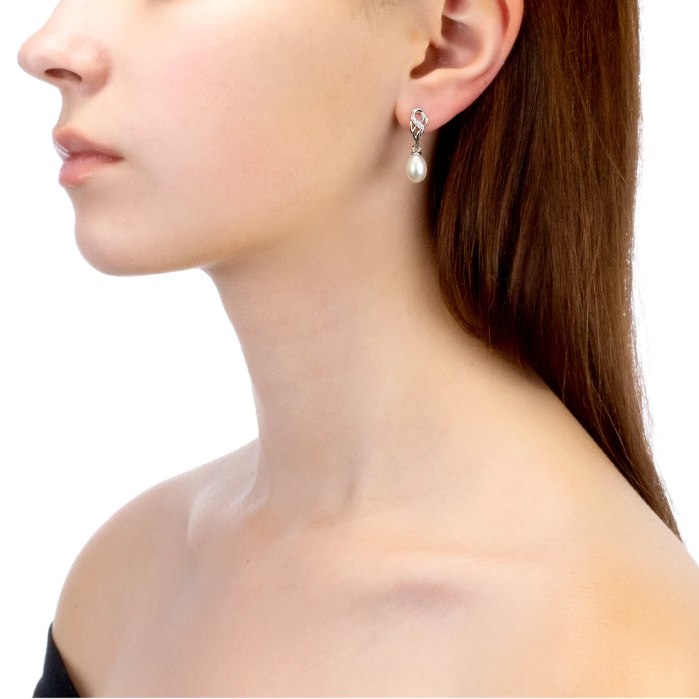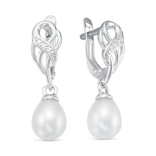 Серьги выполнены из белого золота 585 пробы и украшены жемчужинами пресной воды. Качество жемчужин на серьгах наивысшее, жемчужины имеют очень яркий перламутровый блеск, гладкую и ровную поверхность с минимальным количеством природных изъянов, форма жемчужин каплевидная.